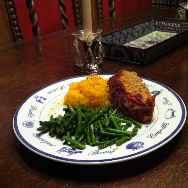 Tell my godson he’s having meatloaf for dinner and his face will fall.  His shoulders will slump and his eyes will have that “dead man walking” stare.  I understand.  We’ve all suffered from CNMD (Chronic Nasty Meatloaf Disorder) at one time or another.  But tell MY boy he’s having turkey meatloaf for dinner and all of a sudden the day’s getting much better. He always asks with anticipation “with butternut squash and asparagus?  Awesome!”.  I love using turkey because it’s much lighter and no matter how hard you mix it, it will not toughen up.  What is important is to season the mixture well because you know how bland ground turkey can be.  I usually always use quick, not instant, oats instead of bread crumbs.  Might as well make it healthful when you can.  The oats just disappear into the mixture just like the bread crumbs.  Last night, however, I found myself out of oats.  Damn.  And after a full day of work, I am NOT going back out into the dark for anything.  Anyway, I knew there had to be something I could use and after rooting around…voila! Le Wheat Germ.  Works great, loses itself in the mixture and, also, packs a healthy, nutritional punch.  Last night’s meatloaf was covered tomato paste but I often make it with a peppercorn crust. Both produce a phenomenal sandwich the next day.  And the recipe doubles well.