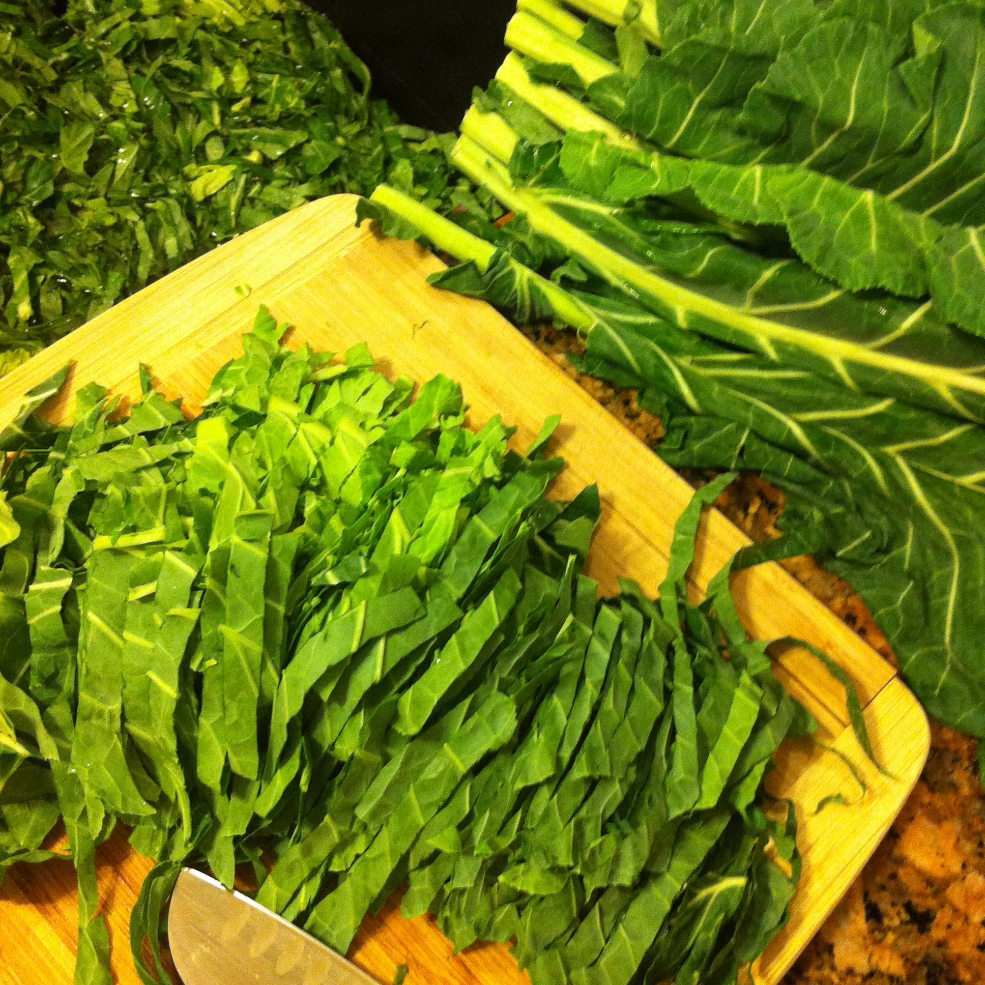 • 2 bunches collards, ribs cut out, washed and cut into thin ribbons
