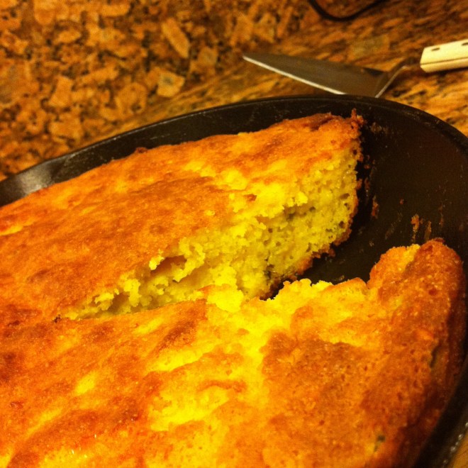 6. Using glove or dishtowel, carefully take skillet out of oven, (DON’T BURN YOURSELF!), pour cornbread mixture into skillet and return to oven.