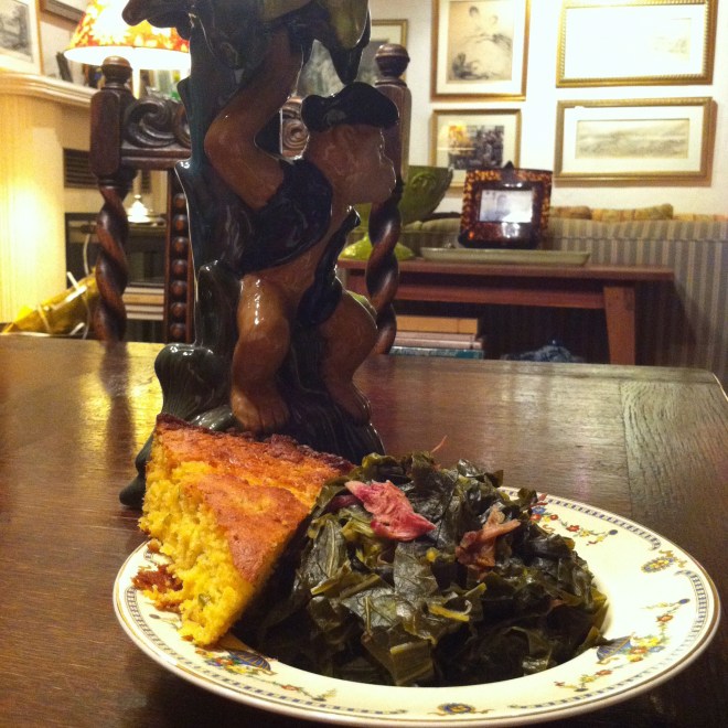 Many, many years ago I went to college at a school in Macon, Georgia.  I did.  My father owned a pretty elegant women’s clothing store in Fort Lauderdale, aeons ago, and, honey, when his little girl went off to school he made sure she was nothing less than the fashion plate she deserved to be!  He went to New York on a special buying trip JUST FOR ME!! (It’s never been better!!) I had pea coats, car coats, over coats, rain coats, pants, skirts, dresses, tops, oh, and the shoes!!! Cashmere, camel-hair, Egyptian cotton, it was heaven! And I was a size 4.  Yup.  I was.  Meanwhile, up in Yankee country, the man whom I would one day marry, was a TA  in a class entitled “Introduction to Environmental Planning and Design” for undergraduates at Tufts.  Really??? At that time Jimmy had a super long beard, really long hair, glasses…from what I’ve heard he was angry ALL the time!!  And he protested.  On the level of get thrown in jail and be on the 6 o’clock news.  He was what we called “a hippie”.  “A radical long-haired hippie”.  With a big smile on my face, I would have, elegantly and with a lot of style, crossed the street to avoid him!  Suffice it to say, he would have looked way down his perfect Greek nose at me and stayed on HIS side of the street.  No love lost.  It was 1975 and we were worlds apart.  We just hadn’t met yet!  Anyway, same time but hundreds of miles away, Jimmy had a field trip planned for his students to look at distressed neighborhoods in Dorchester, pronounced Dah-ches-tuh by Bostonians, and had four undergrads in his ’72 Volvo, (how sensible!). They were leaving Jamaica Plain, on the Jamaica Way, adjacent to the Arnold Arboretum, when some of the students looked out the window and questioned what a couple of women bending over on the side of the road were doing.  Actually, they were in a field.  When they bended over, you could see their hose rolled up under their knees. “What’s out there?” questioned the students.  “What are they doing?”  Jimmy stopped chattering about urban development, turned, looked, and thought “f..k me.”  He thought, “Jesus, Ma!!”  It was his mother and Mrs. Scarlatos.  Mrs. Scarlatos’ son was Jimmy’s best friend since they were two years old!  (I think that is SO nice!)  They were on the side of the highway picking greens.  That’s what Greek moms do.   Good Greek moms! That’s why they live so long, if they’re not hit by a car first!!  Collards are a superfood in my kingdom.  I pretty much never buy bagged.  I buy the prettiest bunches I can find.  These greens pack a HUGE nutritional punch!  On all leaves except the small, pale green inner leaves, I cut out the middle rib, the stem.  I just can’t stand them floating around in my greens!  But that’s just me. I’ll typically buy two large bunches and eventually, take some to my parents.  Of course, my younger sister, Pamela, will be called and she’ll pack some up to take home and then, promptly suck down some here!  For some time now I’ve been using smoked turkey pieces in my greens instead of ham hocks.  The taste is still sublime but they’re much better for you.  That’s not to say I haven’t deviated.  I’ve used ham hocks, pancetta, prosciutto, just about any savory pork product I have in the house and they all work well.  The smoked turkey tastes just like a pork product but you do need to factor in more time. A couple of hours to tenderize the turkey and create a nice broth in which the greens cook.  In the South, collards are always served with cornbread.  I know it’s easy to pick up that light, blue box that costs next to nothing, but homemade is almost as easy, just a thousand times tastier!  Let’s talk a little about the vessel in which you’re going to make your cornbread.  Cast iron skillets.  A gift from God!  There’s a little someone up in Massachusetts that just got one so here are my thoughts.  Water never, EVER touches mine.  I don’t care if I fry fish, water ain’t touching it.  When cooled, I wipe the inside out well with paper towels and then pour a liberal amount of plain, old table salt into the pan.  With a clean paper towel, I rub that salt all over, getting up all bits of fried food and any excess oil.  I might do that two or three times until it’s wiped clean.  It’s SO worth it!  The satiny, beautiful sheen on that pan when you’re finished will make your heart sing!  At least it does mine!  If you want to season a new cast iron pan, pour a little vegetable oil in the pan, rub it around with a paper towel wiping off any excess.  Put it in a medium hot oven, maybe 350°, and leave it there about 15 minutes.  Take it out, let it cool, then put it away.  After that, the more you use it, the more beautiful it becomes.  Just no water, please!  And I’ve got a shout out to my girls at “the Dixie”!  Hey to April and Latoya who always have my culinary back!  Y’all are the best!
