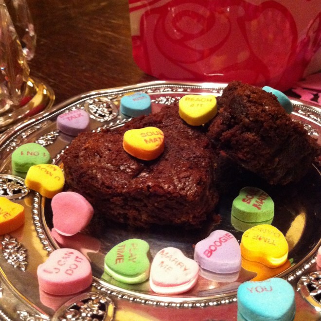 I’ve made countless brownies over the years but I feel the most perfect ones are Ina Garten’s Outrageous Brownies. When you take a look at the ingredients you’ll see why. Past decadent but unbelievably sublime. The only changes I’ve made to her recipe is in the procedure of putting them together. Oh, and no nuts…Jamesy ain’t a nut man. Because they are so incredibly rich I cut them into smaller portions. Also, know this recipe makes quite a few. Oh, and they ship really well, just make sure you pack them tightly in their shipping container. I filled gaps in care packages with boxes of Conversation Hearts, little heart-shaped Red Hots and one, big plastic heart with silly Valentine phrases stamped on it. So, let’s kiss, sweet talk, love ya, text me, URA star, #1fan, and be mine, my baby!