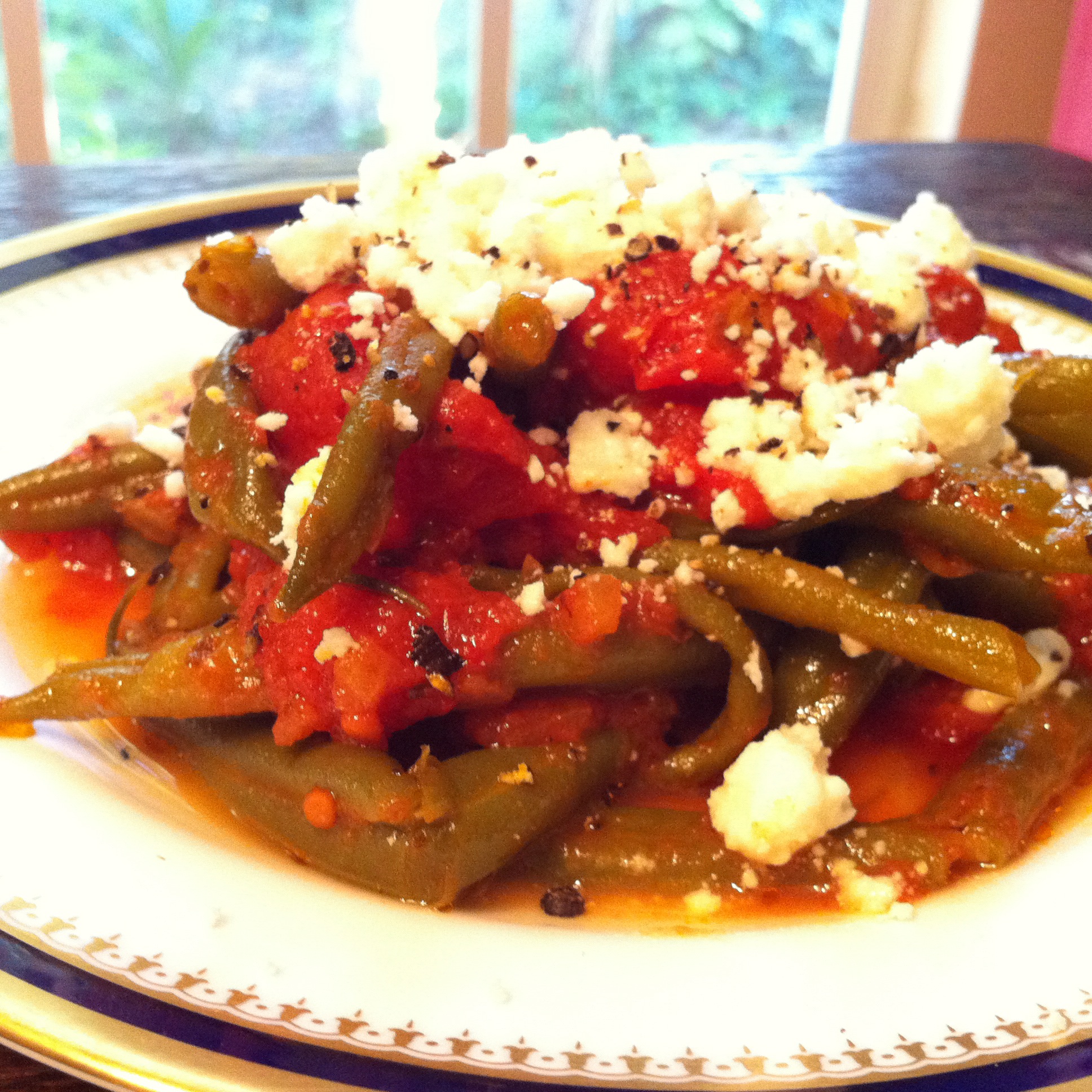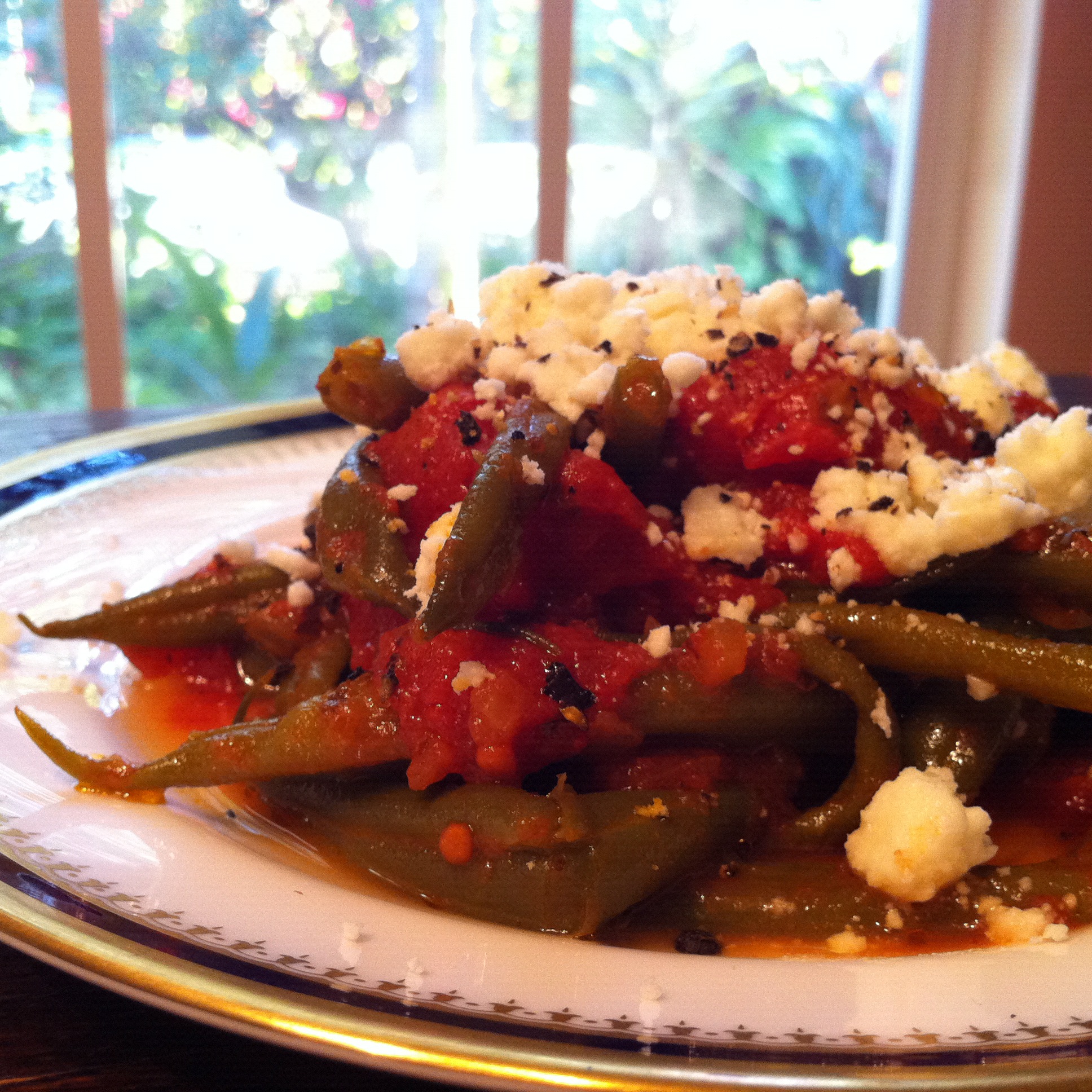Isn’t it strange how as a child, the same things we hate, abhor, detest, we end up loving, downright craving, as adults?  My siblings and I have laughed to no end at the spare, flavorless dinners our mother used to serve.  Once a week my mother would go  to go to the grocery store for a “big buy”.  If we were in the car, she wouldn’t allow us to go in, saying, “You children stay here.  Today’s a “big buy”.  I’ll be back in TEN minutes.”  TEN MINUTES?  A BIG BUY?  That ought to give you a little insight as to my mother’s feelings regarding food and cooking.  She’d try to go to the store by herself and get that annoying food thing out of the way, never, ever suspect when she arrived home and her first middle child would greet her at the front door in the style of Eddie Haskell.  “Hello, Mother.  May I help you with the groceries?”, I would ask in my sweetest but most nonchalant tone.  “Gracias, Cielo!”, she would answer, “You’re a BIG help”.  My mother ALWAYS had words of encouragement for us.  While she was inside the kitchen unloading bags, I would go through the ones left in the car as  quickly and thoroughly as a swat team.  My mother bought only frozen vegetables, hard, square boxes of misery and disgust.  Efficiently, I set all the boxes aside.  Carrots, string beans, spinach, broccoli,  the runner-up for nastiest, succotash.  First place, numero uno for all time nauseating and most hateful childhood vegetable goes to……waxbeans!  Yes.  My mother served us frozen wax beans.  They were yellow and looked as though they had been hand dipped in tallow.  And NOT in an artisanal way.  When all the groceries were inside I would casually call out to who ever was around, “I’m going outside.”  No one ever cared and no one ever paid attention, thank you very much.  I’d grab all the boxes, all of them, and trot around to the back of the house.  Stacked neatly on the dock, we lived on the water, I would take a frozen square, and with a strong and practiced arm, I would skip that box across the canal with all the strength in my 11 year-old body.  Those boxes just skimmed across the top of the water, bouncing four, five, sometimes SIX times.  I know it was hideously wasteful but I really enjoyed it.  Mama always came home from the store in the late afternoon, so I was on the water skipping boxes when the sun was going down, palm trees swaying.  Often the fish would jump.  It was quite lovely.  I knew I had scored when Mama would rip the freezer apart, all the while talking to herself, “Oh, pooh! I know I bought vegetables!  Caramba!  Where could they be?”.  But sometimes, we weren’t that lucky and a box or two would slip past me.  My older sister, Cynthia, and I had only a few ways around these toxic nuggets.  And let me add, my mother didn’t even heap the vegetables on our plates.  She only put maybe three or four beans on each of our plates.  Child, that was more than enough.  My mother never used salt or pepper and there was NEVER butter or any kind of sauce on the vegetables.  They were just boiled.  Making sure my father didn’t catch us, we would swallow the little, yellow, nasties whole with our milk.  Until the day he DID catch us.  I don’t know how Cynthia got her’s down, but I remember thinking, “I don’t care if I’m still here at breakfast,  I’m.  not.  eating.  them.  I’m not.”  Everyone was long gone from the dining room, Cynthia doing homework, Tommy and Pamela were splashing away in the bathtub readying for bedtime.  And there I’d be.  No elbows or forearms were ever tolerated on the table and sitting up straight was mandatory.  The night would just drag on, my parents walked by every once in a while, always saying the same thing, “and don’t even THINK about getting up until you finish all of that!”  And I just sat there, thinking the same thought, “I’m not eating this.  I’m not.”  I overheard my mother reading to Tommy and Pamela a bedtime story or two and I felt big waves of hopelessness and despair wash over me because now I truly COULDN’T eat them.  They were stone cold.  And hard.  And I didn’t have any more milk.  Right about then my father put down the paper and barked at me, “Get up.  Put your plate in the kitchen, brush your teeth and you’re to go straight to bed.”  Okay…I can do that.   And the beauty of this whole memory is, the following morning you would never have known this had happened!   There was absolutely no mention of the dinner fiasco of  the night before.  My parents would be happy and loving, embodying the philosophy, “It’s a new day!”  Today IS a new day, but not new enough to eat wax beans.  Or broccoli.  Or cauliflower.  But just about every other vegetable is great.  I love this dish, stewed green beans, because it’s so darned easy and it gives one the full feeling of eating something heavier, like meat or fish.  The sautéed onion gives the beans and tomatoes the sweetness needed and the olive oil mixed with the broken down tomatoes results in a silky, savory sauce.  Fassolatha is served with a healthy sprinkling of crumbled feta on top and crusty bread to dip in the sauce.  I think it’s sublime!
