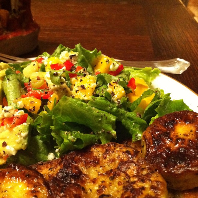 This is my House Salad which can be served as a side salad or main course.  It pairs beautifully with everything.  Anything grilled or jerked, seafood, chicken, pork, even more vegetables.  Tonight we’re having my House Salad with grilled medallions of eggplant on garlic whole grain crostini.  Because Gorgonzola is kind of strong, I’m careful not to add too much otherwise it will dwarf the buttery mildness of the avocado and peach-like flavor of the mango.  Hey, peach would be good in this.  Just make certain the avocado and whatever kind of fruit you’re using are ripe.  The ingredients really compliment each other.  You’ll love it.  It’ll make you feel like a Mermaid!