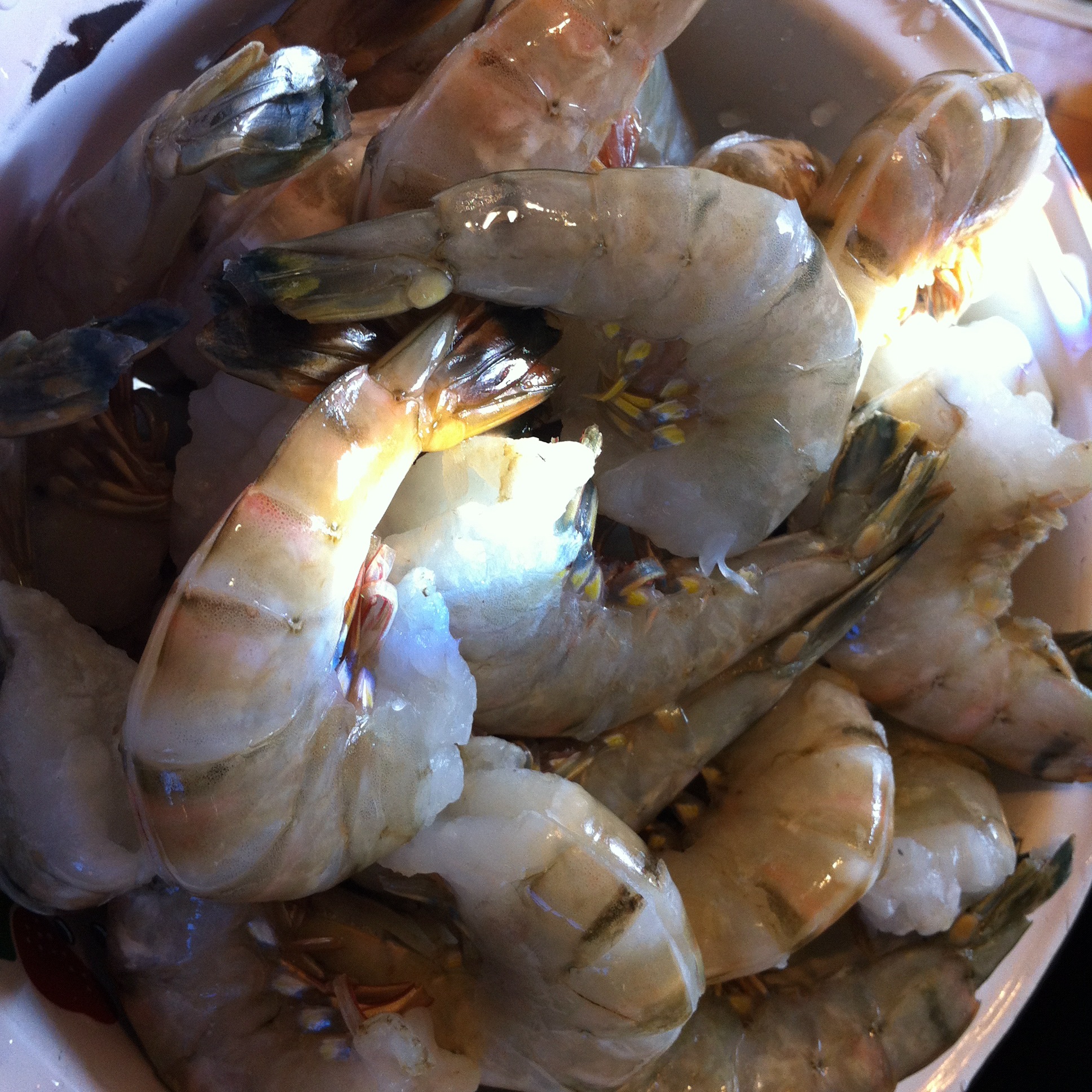 - 2 pounds of the largest shrimp you can afford, try to get e-z peel. If e-z peel’s not available you’re going to have to devein but leave the shell on all those shrimp. It’s a bit of work and you want to leave the shells on as they help keep the shrimp tender. If you do have to devein, using a small, sharp knife, cut just through the shell, from the outside, starting from the tail to the top. Carefully pull out the dirt line and move to the next shrimp. I’d REALLY try to get e-z peel if I were you.