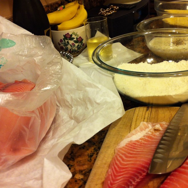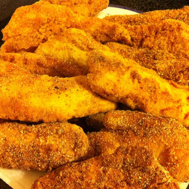 Today I have for you my recipe for fried fish, which most people really like even if they don’t particularly care for fish.  James and Jimmy love it, I always have plenty left over to take to Dad’s house and for breakfast, lunches or snacks the following day.  I absolutely adore fried fish for breakfast especially if it’s on my plate sitting next to soft, scrambled eggs. Typically I serve it with collards and biscuit or collards and cornbread and there is always, ALWAYS a big ol’ bottle of Crystal Lousiana Hot Sauce.  It is most definitely an “everybody’s home for dinner” dinner!