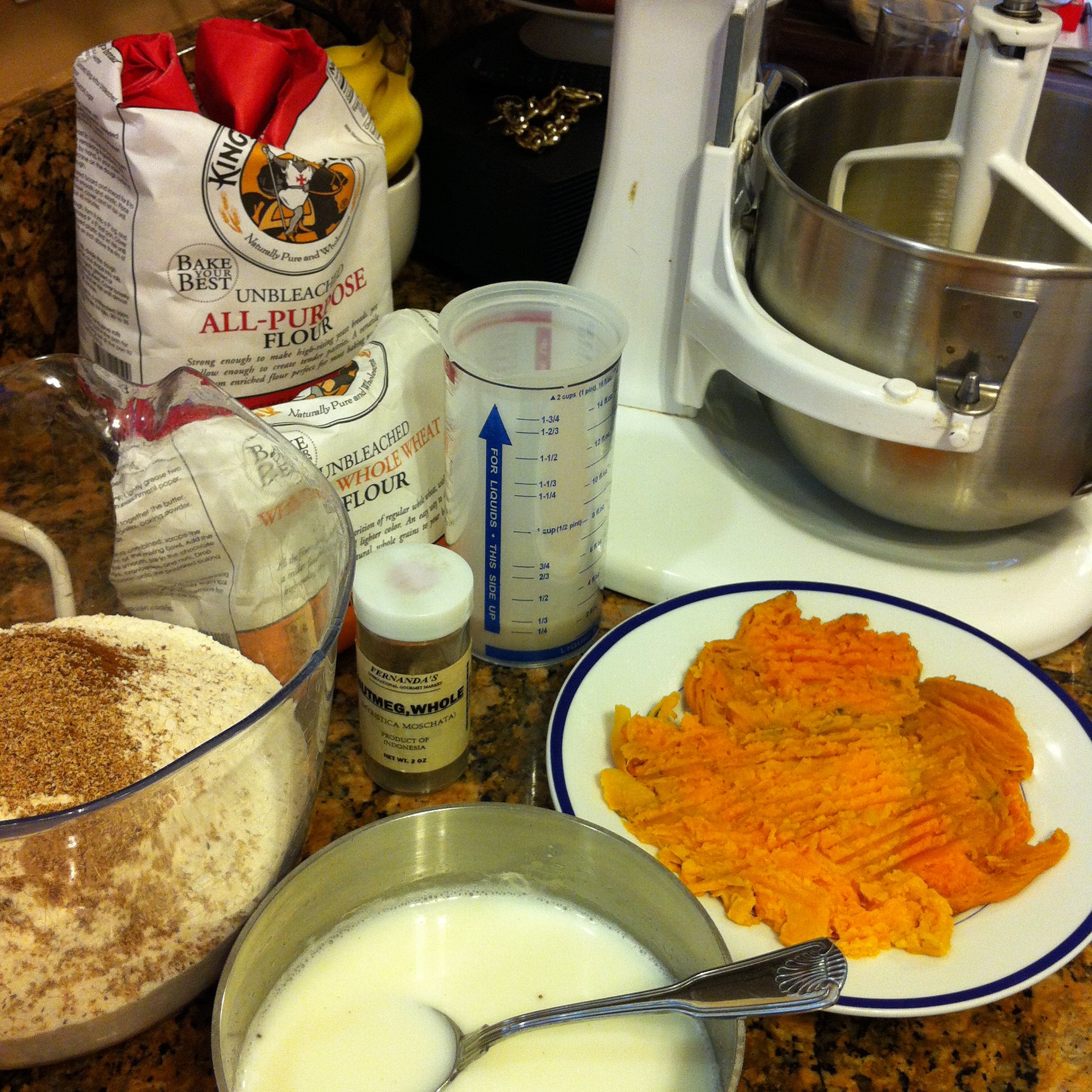 - 1 1/2 cup cooked, mashed, cold sweet potatoes