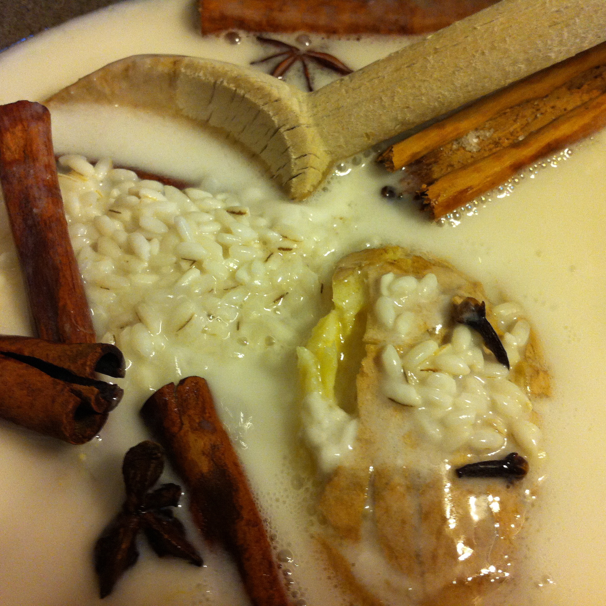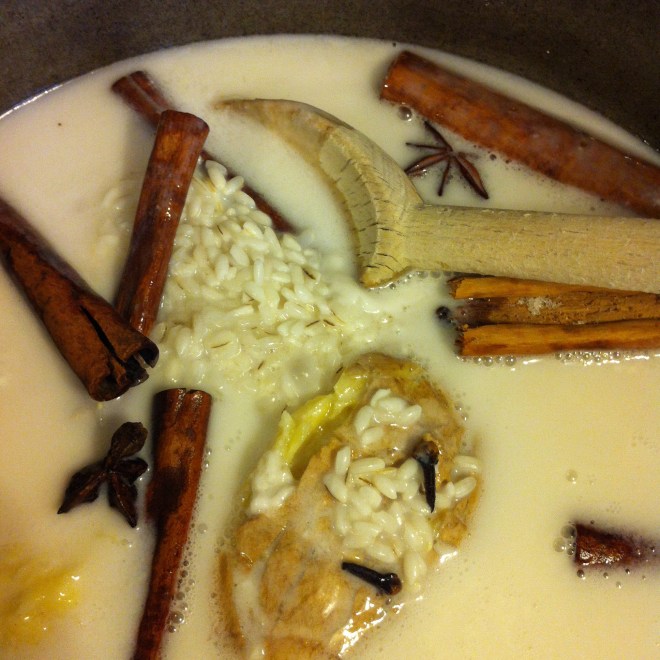 This is an exquisite recipe from Puerto Rico, rich in spices, smooth with coconut milk and warm in comfort and steadfastness.  We fall back on it because it says the right thing to us.  It does the right thing for us.  It will fill part of the black hole.  It’s home with an offbeat twist.  All the ingredients are found at the grocery store and, lagniappe, it’s a walk away kind of recipe.  It just knows what to do and how to do it.  This is a rice pudding, cooked in coconut milk in lieu of whole milk.  Replacing vanilla, are whole cloves, cinnamon sticks, freshly bruised ginger and star anise.  We’re not in Kansas anymore.  Trust me.  It’s unbelievably satisfying!