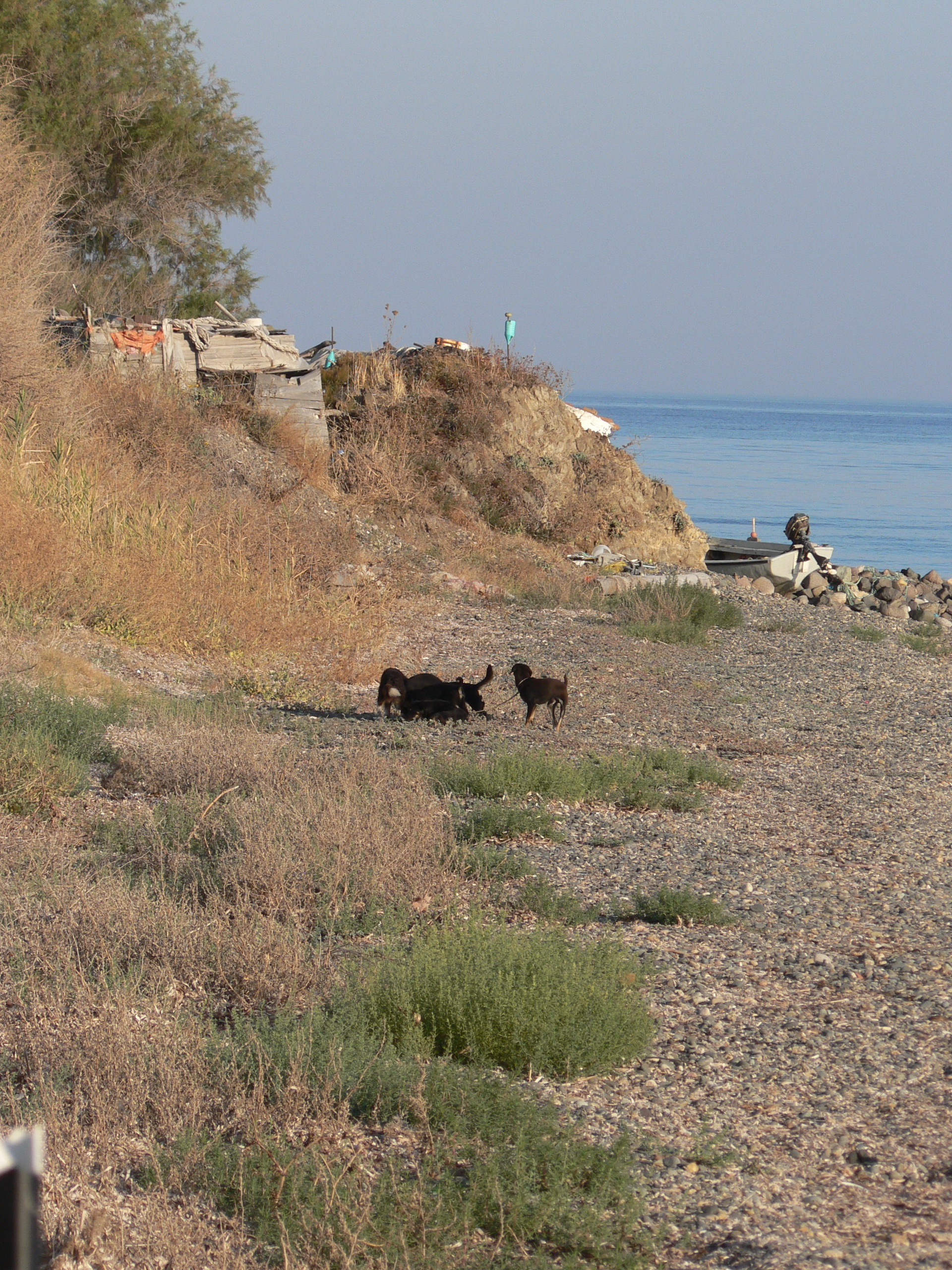 I’d trot down the steps figuring that would be a sufficient warm up, there really isn’t any place to sit and stretch, and then, on my way down, decide which direction I would go. Funny, but each morning I would inevitably start off in the same direction. Away I’d go with my walk-man, then in later years, an iPod, music blaring just way too loud for my poor eardrums but I felt incredibly happy and free. Leaving the Sunrise, that’s the name of the hotel where we stay, I ALWAYS turned left and headed towards the hot springs. I would race-walk on the winding road and my unbreakable rule was any hill, you absolutely must run. Up AND down. Those are the rules. And you can’t stop unless you come across something really cool or pretty or dead. My favorites tunes would come on, helping me make up the steep hills. I met the most darling little dogs sitting at the end of the driveway of their hotels or family’s summer home every morning. They’d watch, loyally guarding their homestead, and at attention, too. It took a few years for us to become friends, but we did. There was a pack of wild dogs that lived on the beach but they didn’t look feral. They were small and cute, however, as I’m not one to temp the fates, mutual respect was observed by all. They lived close to a guy who would be homeless except HE INHERITED A SHACK ON THE BEACH AND THE SAND IT SITS ON. Can you imagine being left beach property? Below is a photo of his “shack”, I snuck up on it and took the picture as fast as I could before the dogs alerted the man of my presence. He’s mad as a hatter and I wasn’t about to upset his applecart. Things like that just scare me to death!