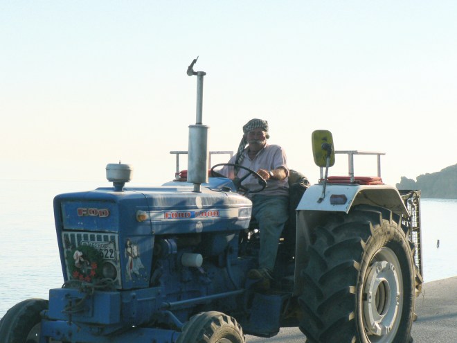 Continuing on, I passed older, sprawling hotels, newly renovated with flowers everywhere, lemon and orange trees jumping out from around every corner and majestic swimming pools all lined with local marble. Old school meets new school. Up and down the hills I welcomed the gusty winds as I began to feel the morning heat. I’d still be riding on happy, it’s just so incredibly gorgeous. The Aegean was right next to me, waves gently lapping at the stone beach. Can you stand it? When I heard fast, hard music, I’d look around, not that there would ever be anybody out, and play my version of air guitar. I love classic rock and, in years past, would carefully pack my fave CD’s, I ran in some kind of reverie and, when my most loved chorus would come on, I’d burst into a blistering air guitar riff. And that’s when the sound of a deafening horn BLEW me off the road. Scared the life out of me! A chain of foul and ugly words spewed forth from my mouth as I was harshly jolted out of La-La land. Almost falling, I spun around to see who was the dolt, the dunderhead, the ASS who was fixin’ to feel my wrath TAKE.HIM.DOWN. I turned and saw the most mammoth tractor, dressed with a flowered wreath and finished with a smokestack train whistle. Seated on the very top was a man with the biggest handlebar mustache I had ever, EVER seen. And he was laughing at me. Yes, laughing. Hard. He had on one of those black and white checked headscarves like Yasser Arafat used to wear to block out the sun. I spoke no Greek, none, except for my food vocabulary and what was I going to call him? You freakin’ loser stuffed grape leaf? You cold glass of white wine? Well, I showed him. I gave him my haughtiest, scathing look and off he chugged, laughing all the way down the road. In the following days I’d hear him coming and, you bet I made it a point, I would just stand out of the way until he passed. A full year passed, we’re on vacation, YAY!, and I’m back to working out. I heard the familiar chug-chug-chug. As he passed I didn’t reward him with a smile but I did, ever so imperceptibly, give him a polite nod. That’s it… that’s all he got that year. Now we’re into the following summer. Two years later I’m back and running on the same road, hot, sweaty, winding down with Freebird, and I hear it. Chug-chug-chug. I was elated! By then I had been taking Greek for a few years. Every so often I would think of this man, almost fondly, during the year especially during winter when the days would get dark early and I longed for a 9:00 p.m. sunset. By that time my husband, Jimmy, and I gave him a name, “My/Your Friend”. He tooted his horn, still laughing at me, but this time I managed to sputter my name and my nationality as my face lit up with a smile to match his. I saw him at least every other morning and we greeted each other with big smiles. laughter and waves. I have no idea where he was going or where he’d been. On my last day I took my camera. This is before cell phones with cameras. I’d run, take a few photos, run, take a few photos and then I heard that familiar engine cough. I turned, smiled and waved. I gestured with my camera, questioning was it okay to take his photo? He just laughed and kept smiling but brought the tractor to a halt giving me enough time to snap a few shots. The sun had just come up and was just blazing away behind him. It was too, too bright, the photos would never come out. And I knew he wouldn’t turn the tractor around just so I could take his picture, he seemed to be a real man’s man. What I had would just have to do. The following year I never saw him on the road but, one day, driving through some village, in the corner of my eye, I saw him, headdress on, sitting outside a taverna with his cronies flipping his worry beads. I felt so much better that I knew my friend was all right. I hope he’s well. I hope I see my friend. And I hope he’s on his tractor. I’ll keep you posted!