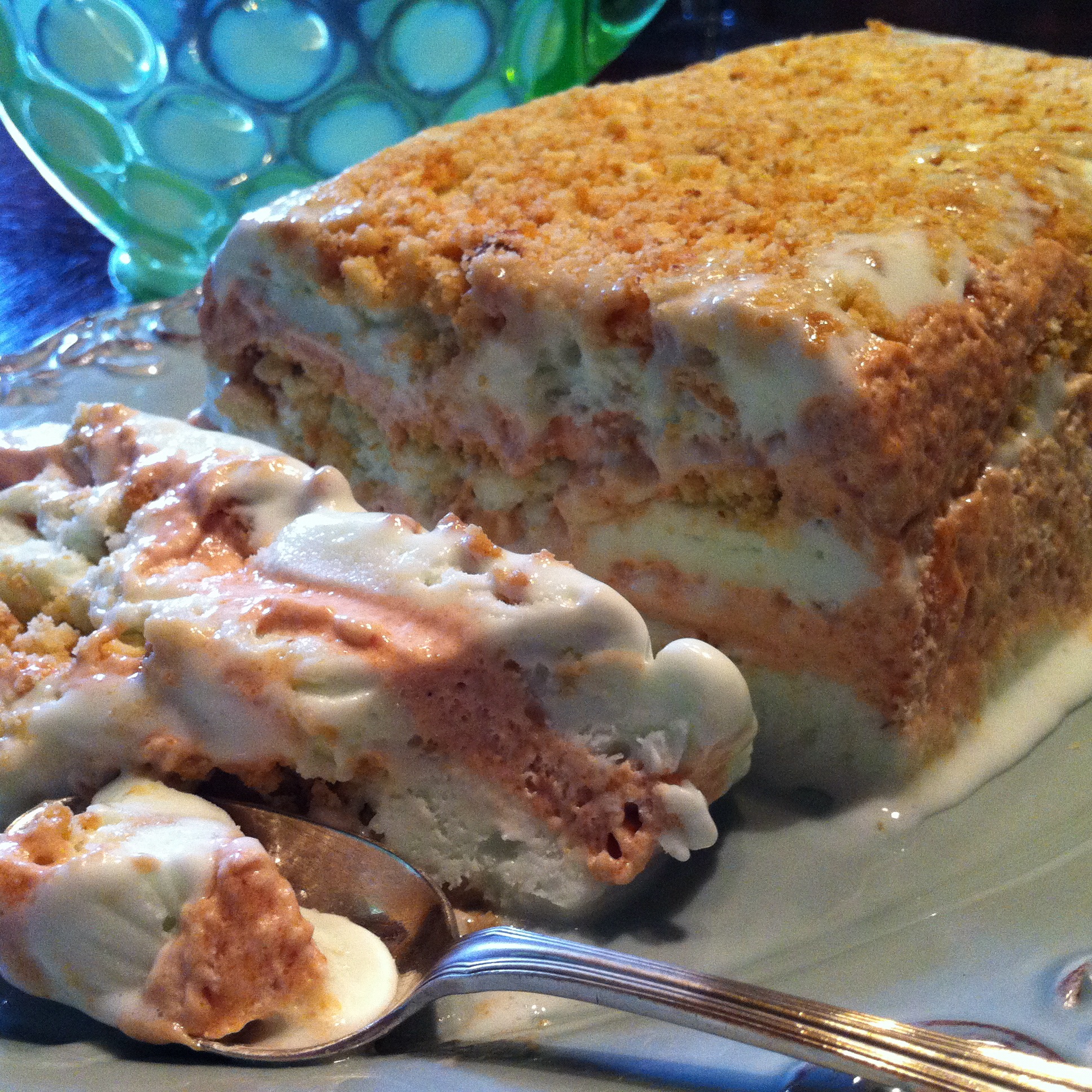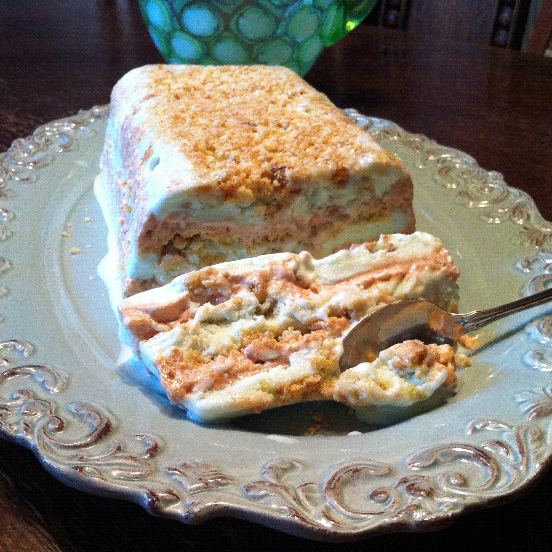This is such a terrific summer dessert! It’s great to serve at your own house or take to a party.  It can be assembled days in advance and kept in frozen limbo until you need it.  The ice cream flavors are completely up to you as well as any cookie crumbles you wish to use.  If you like nuts, use them.  If not, lose them!  Also, the whipped topping can be left as is or the flavor of your choice may be folded in.  The only strict rule is that it does need to set up in the freezer overnight.  Four hours just doesn’t cut it, as is evidenced by the Key Lime I put together.  But that’s the only direction which should be observed.  I don’t really have a name for this.  I guess we could call it “Frozen Stuff” although Pamela would call it “Frozen S**t”.  She’s bad that way.  This dessert can be assembled in a 9X13 dish, a loaf pan, or any bowl that has a shape you like.  If you do choose a loaf pan or bowl, line it loosely with plastic wrap to make it easier to pop out.  This recipe calls for a 9X13 dish so if you’re using a smaller dish, eyeball your amounts and cut back accordingly.
