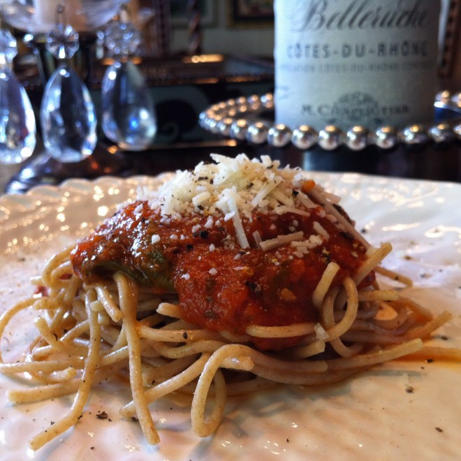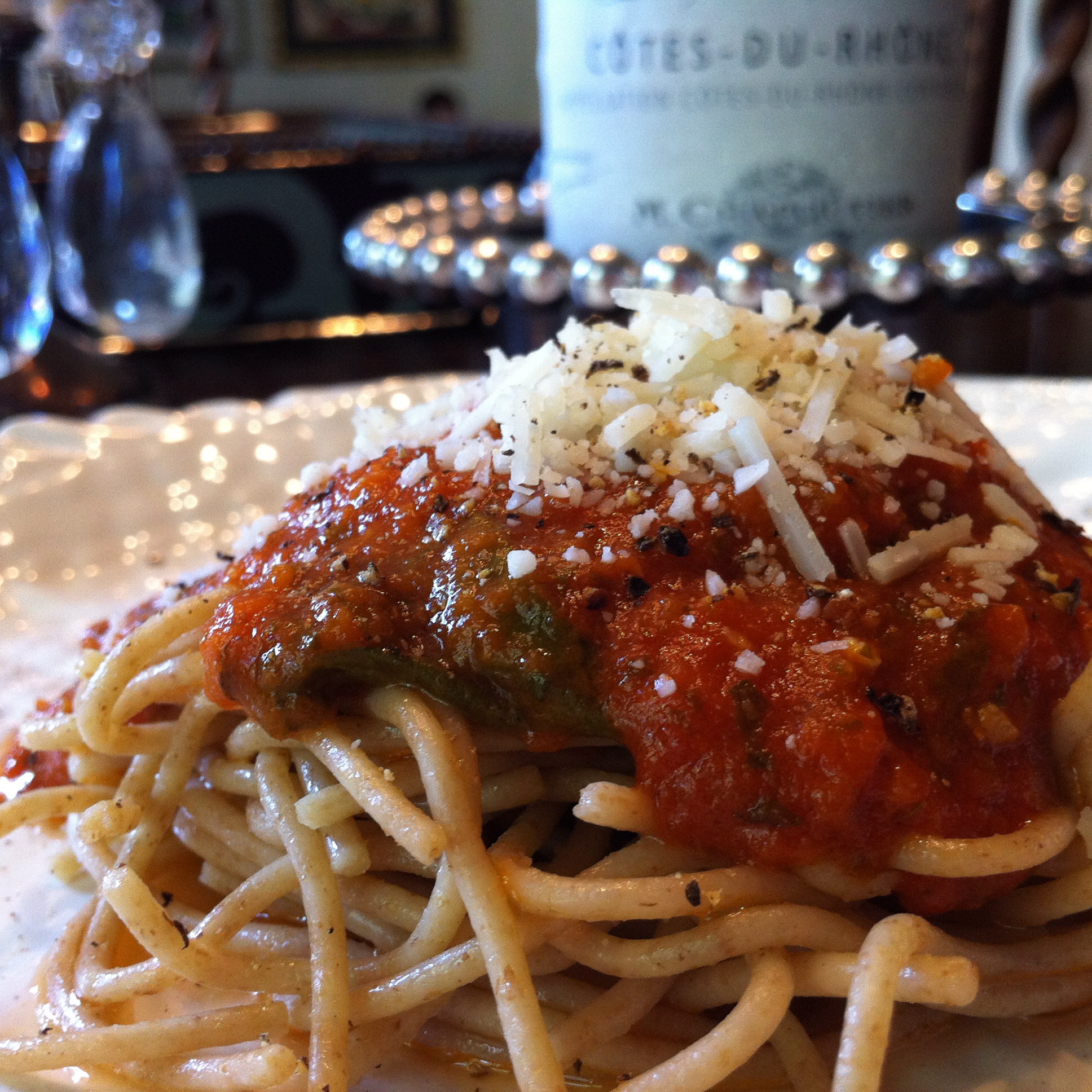 The following recipe is a little more sophisticated than what we gave the children but it is still a magnificent way to squeeze in more vegetables.  I grate zucchini and add it to so many of my dishes, this being one.  Grated zucchini and chopped spinach both seem to disappear in this so with a large amount of savory vegetables it packs quite the nutritious punch.  If you’re really pressed for time, by all means use frozen chopped onion and bell pepper.  I also use a great deal of turkey products.  In this dish I use ground turkey and spicy turkey sausage which really isn’t spicy but just well seasoned.  Jennie-O brand is great in this dish.  When it comes to pasta I’m crazy about the whole grain lines out on the market.  Whole wheat pasta is not the block of sticky lead it used to be.  Use which ever brand strikes your fancy but do try it.  You’ll be pleasantly surprised.