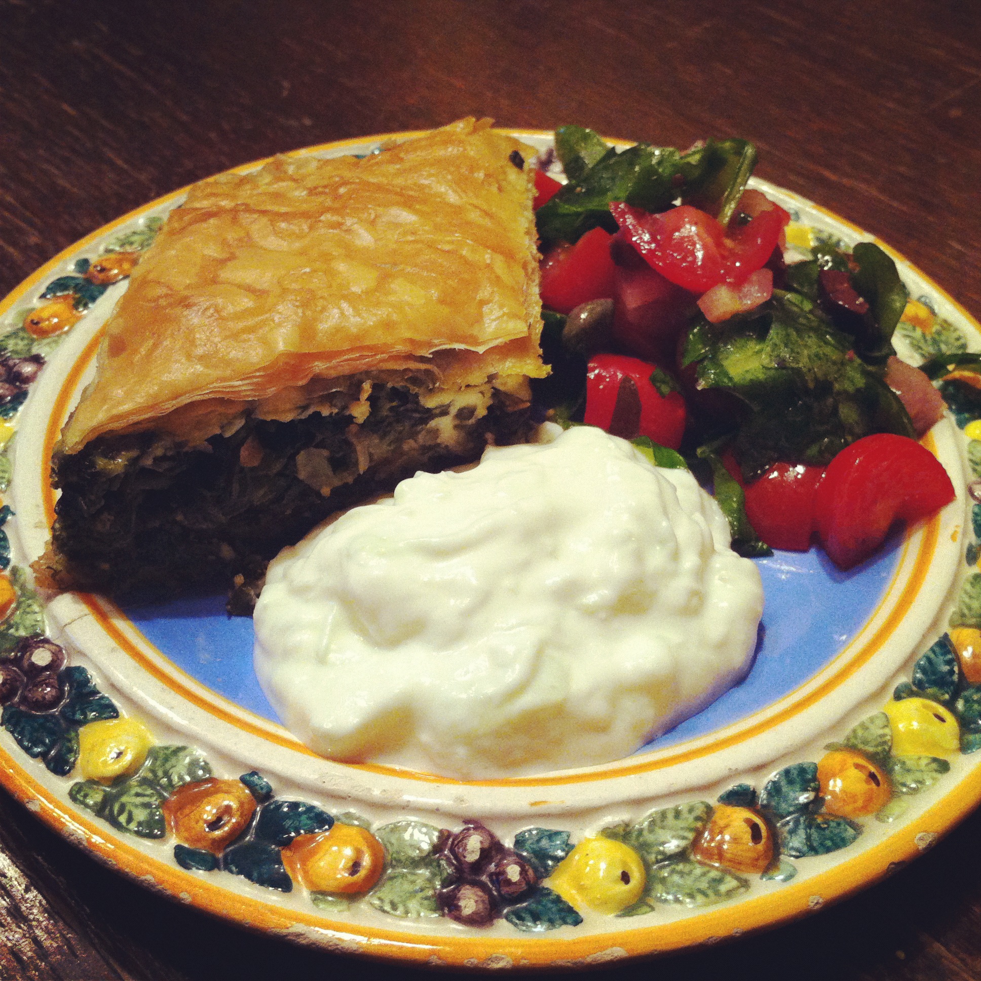 A sublime Greek dish, Spanakopita is pretty easy to prepare, completely satisfying and freezes beautifully. An authentic Spanakopita is slim with spinach and other greens surrounded by diaphanous sheets of phyllo that shatter in a burst of crispy heaven when baked. Yes, I am a big fan of phyllo. It is found in the frozen section of your grocery store usually in the pie section. Some people butter every sheet, my preference is every two sheets. Sometimes I use butter and it would be a good one. Plugra and Kerrygold are both good products. Often I use Greek olive oil in it’s place. It’s just as rich and fulfilling but much better for you. In tandem with the spinach I like not only fresh dill but also fresh mint. I always use a high quality feta and sometimes jack the flavor up by adding a bit of freshly grated parmesan cheese. Your choice. Regarding eggs, whites are totally fine but use whites from eggs you cracked. The ones in the cartons are just too thin and the filling oozes and spills all over the place. I think I’ve covered everything. Let’s get started!