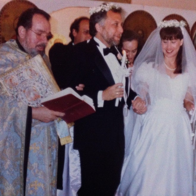 This morning was the ordination of a young man who went from Deacon to Father. What a joyous morning! All kinds of hot-shot priests flew into town to officiate. I knew my brother-in-law’s brother would be on the altar. My Jimmy had mentioned that Father Alex is the young man’s spiritual father, helping and guiding him through life as a young boy, through Hellenic College, the Seminary and now, priesthood. The entire church would witness his vows, vows that are forever. Our son, James, was on the altar also, in his black robes…I call them “big boy robes”. There was a wonderful Psalti chanting in Greek throughout the entire ceremony, his voice rising and falling in hypnotic notes while the priests on the altar sang and chanted their designated parts. Then came the deep, baritone response “…through the ages of aaaAAAges”. Jimmy turned and whispered in my ear, “Yup. Father Alex is here.” That low, rich timbre catapulted me back 23 years to when Jimmy and I were to be married. When we first made plans to marry I got all the paperwork from St. Anthony’s parish church. MY church. The only church I knew. The only church I wanted. Turns out the Miami Archdiocese would have to annul Jimmy’s previous marriage in order to be married in the Catholic church. Jimmy was furious. “I am NOT having a panel of strangers in Miami pass judgement on me. They don’t even know me.” Well. Okay. I’m strong. What matters is what’s in my heart. I can marry in a church that’s not necessarily mine. The Greek church is not THAT different from the Catholic church so it was decided we would marry in the Greek church. But I told Jimmy, “You need to know RIGHT NOW I’m not doing anything. I’m not taking any classes, I’m not going to any counseling, I’m not doing anything.” He said that was fine and that he would take care of everything. The day came when we were to meet with the parish priest whom, as yet, I had not met. I recall it was a hot day but I was modestly dressed, my years at St. Anthony ingrained in me the appropriate way to dress in ANY church. Jimmy and I were shown into the priest’s office. Manners kicking in I immediately stretched out my hand and smiled as the introductions were made by Jimmy in Greek and English. My heart just sank. I knew, I KNEW, we were doomed. The priest didn’t even stand up from behind his desk to greet me. He just looked at me. I knew he was judging me, categorizing me, grouping me with that brand of no-faith Anglo Philistine parasite that just takes up space on this planet and breathes other people’s fresh air. Well, guess what? I WASN’T that girl. Yes, I was a “bad girl” but I was a “bad GOOD-girl”. My stomach went into knots. I looked at that man and thought, “Oh, God. OH, GOD. This is a bad man. A bad, bad man.” The priest’s eyes narrowed when he looked at me, he pursed his lips and spoke down at me. I broke down. My heart was screaming, SCREAMING I tell you, “This man cannot marry us. He cannot marry me.” Jimmy and I had been through so much. It had been difficult and rocky from almost the moment we met. The priest spoke Greek to Jimmy knowing full well I spoke not a word. I turned to Jimmy knowing the fateful words had to come from me. After all we had been through and now this? In a low voice I choked the words out to Jimmy, “I can’t do this with this man. This man cannot marry us.” There. It was out! I struggled unsuccessfully to control my tears. I couldn’t breathe. I knew if I did I would completely break down. Every pore of my being felt an odious spirit emanating from this man and I couldn’t stand by and let this most precious of sacraments be condemned. I bowed my head so he couldn’t have the pleasure of witnessing my grief but Jimmy saw the heartbreak and anguish building up inside me. He leaned across the desk and in a cold, rapid fire burst of Greek Jimmy said something to the priest ending with, “Get Father Alex on the phone. TORA.” Tora means “now”. The tension could be cut with a knife and the priest was furious. I had never even met Father Alex, I only knew him as my future brother-in-law’s brother who happened to be a priest. I barely knew Jimmy’s family. WELL. The priest made the fated call. Jimmy spoke into the phone, in Greek, then handed me the phone gently saying, “Here. Just talk to him”, and then he and the priest left the office. I couldn’t speak. I was too busy trying to contain the flood of pent-up tears and snot. I took the phone and scarcely let out a small “hello?”. What came next I will NEVER, EVER forget. A deep, booming voice took over the phone and asked me, “Alicia, what’s wrong? What is the problem?” Trying desperately to curb my sobs and manage some sort of composure I explained my position and thoughts. That I didn’t know this man but that I felt he wasn’t a good man. He wasn’t a kind man. He wasn’t a man of God. I had never been married. I wanted the priest at my wedding to be a spiritual, insightful, loving man. I told Father Alex I couldn’t have this man marry us. Then came the deciding question. “Alicia,” he said. “Do you want to marry in the church or do you want to get married by some justice of the peace in some office somewhere?” Are you kidding? I’ve always felt if you ain’t married in the church then you ain’t married. I squeaked out a pathetic, “In the church.”, and Father Alex’s rich, baritone voice answered, “Good. I’ll take care of it.” He blessed me then asked to speak to Jimmy. A few weeks later we set the date. And Father Alex HAD taken care of everything! We were to be married the end of July. The day before the wedding Jimmy mentioned in passing, “Oh, you need to have some crowns made for us.” Crowns? “Just something with some flowers on them or something. And they have to have a ribbon connecting them. ‘K?” Sure, I thought. There were a couple of gay guys that had mov