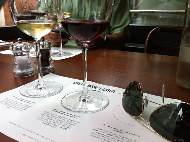 We settled in, ordered a bottle of water and began perusing the menu.  Oh, glory be!  It was beautiful.  And to truly show that the god’s were smiling upon us the daily wine flight was completely Greek.  While waiting for our wines to be surrendered to us we decided upon two small plates to be split.  Roasted sweet potatoes, sauteed spinach, girolle, (a pale yellow or orange wild mushroom ours being from Scotland),  sandwiched between more roasted sweet potatoes and topped with a gorgeous slab of saganaki cheese broiled to a golden perfection.   Oh, wait!   And finished with a generous drizzle of small-batch Greek olive oil.  The second plate to be shared was a stacked dish of tomatoes roasted with fines herbes, guacamole, cold medallions of wild caught local lobster, another dollop of guac topped with a crisp round of local country bacon.  CAN I GET A WITNESS???  By the time the wine flight came out and I could barely contain myself.  It was exceptional.  Unfortunately, it was a bit of a tease and I wanted more…lots more!!