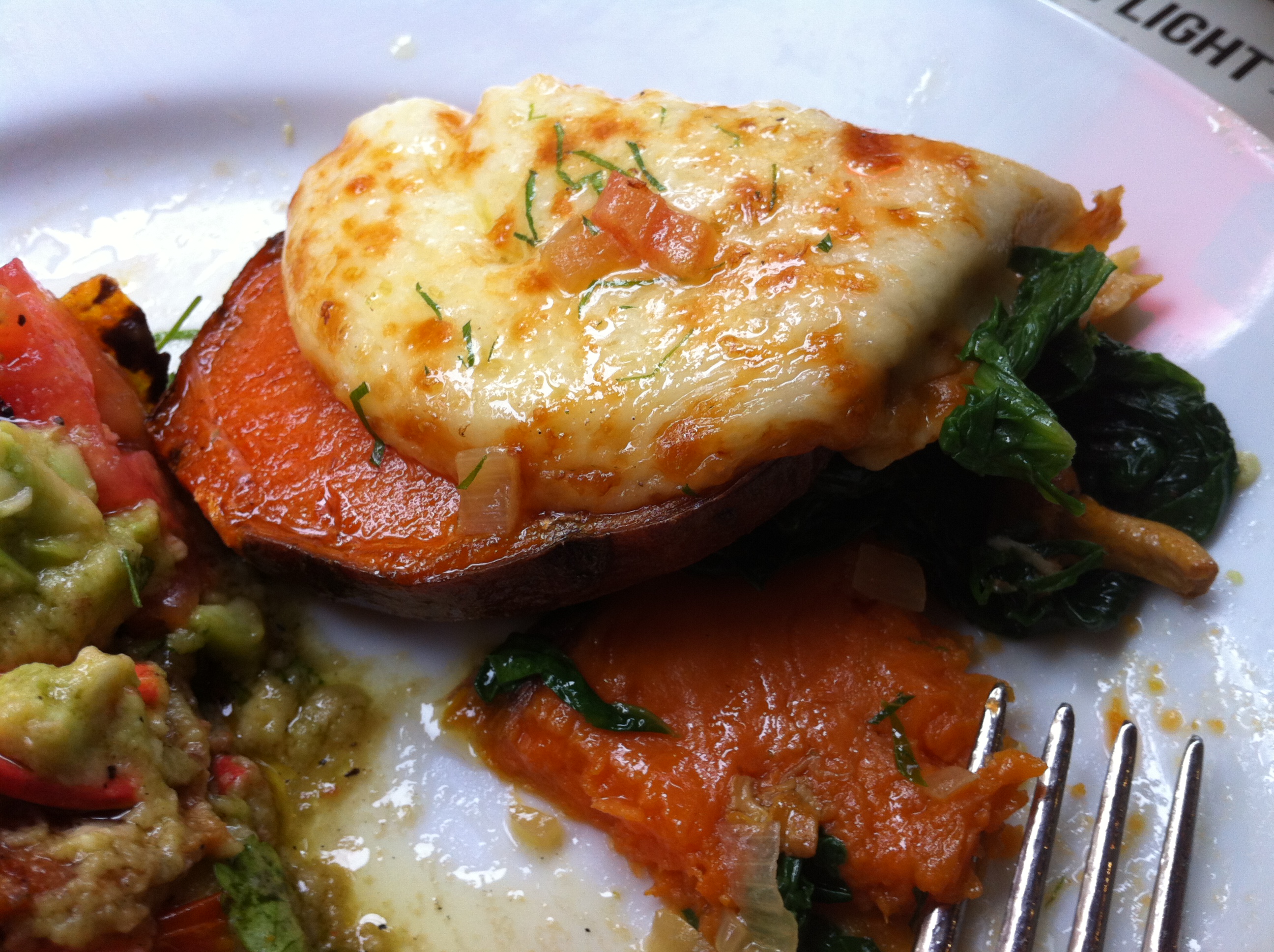 Then out came our plates.  What joy!  What bliss!  Both were just brilliant.  The Hadzidakis white was perfect with the silken avocado and buttery lobster.  And the Naoussa, you ask?  Mercy.  Like a Pinot Noir it cut through the richness of the sweet potato and the golden slab of saganaki cheese.