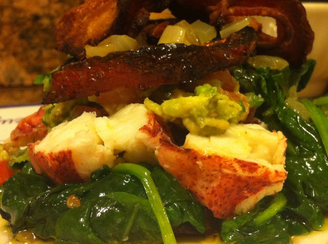 We kept marveling at the knockout meal we were so thorougly enjoying all the while questioning why we don’t have something like this at home?  Local is so exciting and gratifying but nooooooo.  We have places like the Cheesecake Factory, (can you say morbidly obese to me??), or even worse Appleby’s.  Although I’vd been told that Appleby’s serves likker sooooo… I might have to take that observation back!!  But my point is that even if food is rich if it’s clean and eaten in small amounts it can only enhance the quality of life.  All you can eat is NOT the way to go.  Anyway, enough of my preaching.   I ate ALL of my lobster dish before I could photograph it so last night I made my version of it.  I added spinach sauteed with a little shallot to add another layer of flavor as I really wanted another green vegetable.  People, it was so good!  Granted the bacon wasn’t local but I bought the best I could find.  Well worth the effort.