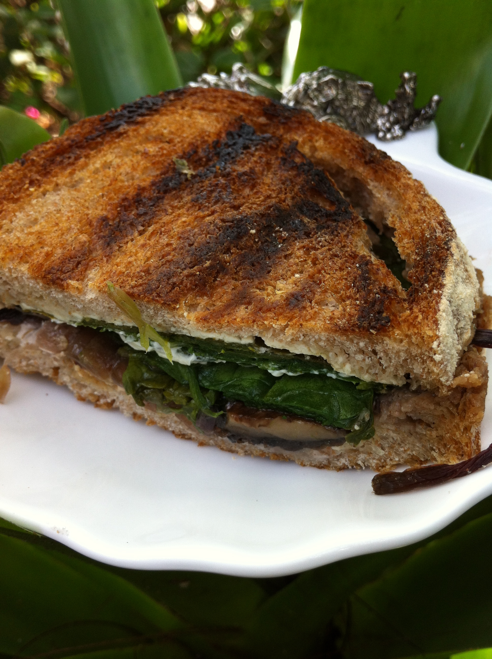 Another option is to use this spread on a low-fat vegetable panino. I use a good whole wheat, whole grain bread. In a hot pan quickly coat with non-stick spray and add thinly sliced red onion to sear. Remove and add whole portobello mushroom caps, gill side down. Turn when needed to cook through. Spread cheese on both insides of bread, add vegetables and grill on panini pan. I use a George Foreman grill. I also put in the sandwich roasted red pepper strips and raw, organic baby super greens. What ever you like is what you can use.