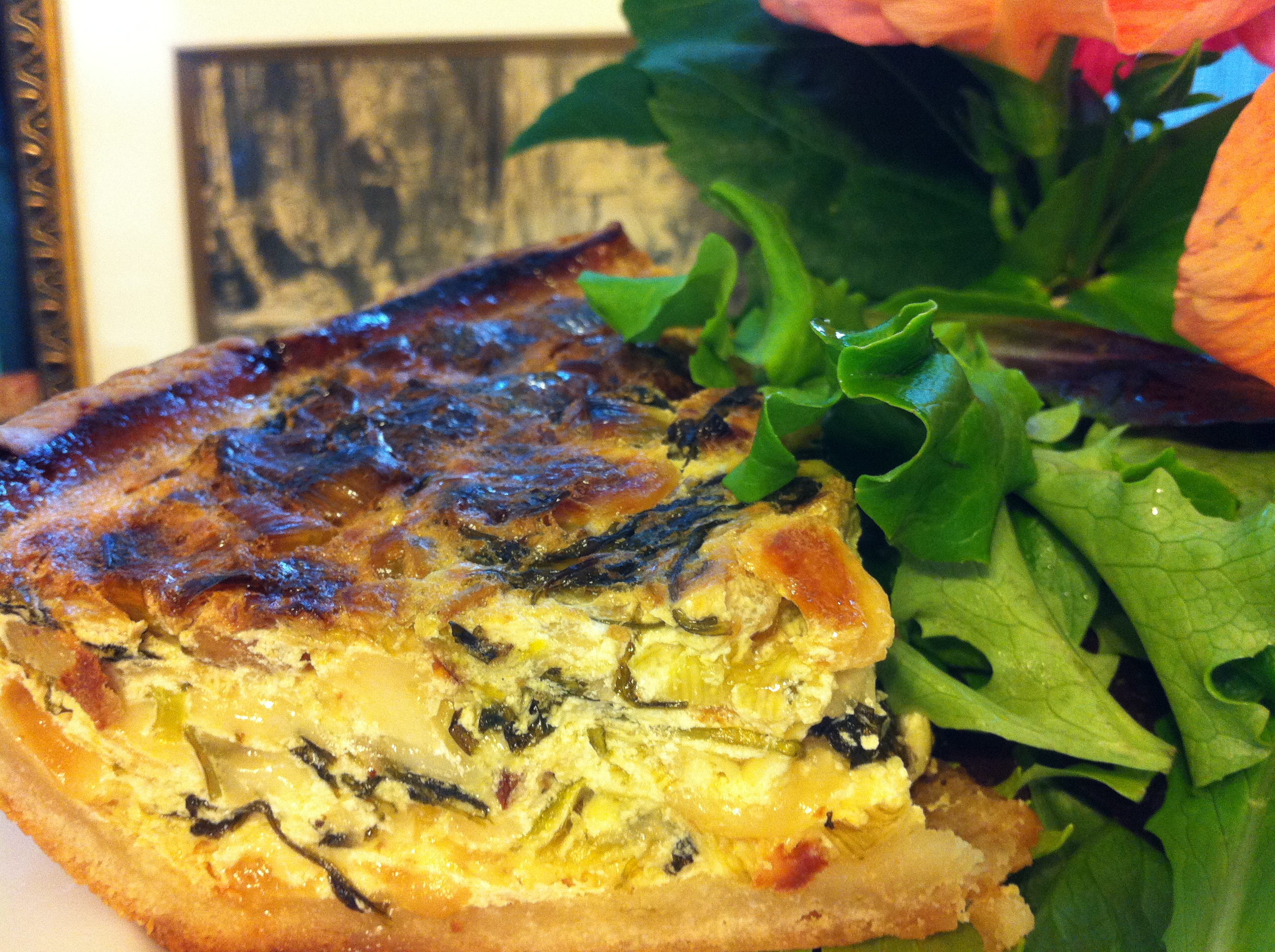 Earlier this week I met some dear friends for breakfast at a small, tucked away French restaurant. There were all different kinds of quiches on the menu, ALL calling out to me. I decided on spinach and at the first bite was not disappointed. The baked custard filling was smooth and rich and each mouthful ended with the round, full flavor of cheese. I had the choice of potatoes or a baby green salad with a vinaigrette. Being breakfast I naturally opted for the salad. Mama used to serve us sirloin burgers or grilled cheese sandwiches sometimes for breakfast if she had nothing else to give us. We often had kind of off the wall meals. Anyway, my breakfast was splendid but it left me wanting more! I wanted quiche for dinner. I wanted more of that baked custard filling and if it was lower in fat, well, all the better! Now pie crust being pie crust I just couldn’t compromise. There’s no substitute for butter or lard. You either eat it or you don’t. But I could certainly improve on the fat content of the filling. And I seriously jacked up the amount of vegetables. Paired with a gorgeous baby green salad for dinner…I was one happy girl! We’re not big meat eaters but we do enjoy a bit of the pig for flavor. Often I use a couple of turkey bacon slices crumbled up. A little finely chopped pancetta rendered is lovely as well. I’m really crazy about those huge boxes of organic greens for cooking and salads. To this quiche I’ve used the entire box of baby arugula, baby spinach or a fantastic blend of baby greens called “Super Greens” by Organic Girl. Infinite kinds of cheeses can be used, the flavors just need to complement the pie. Just because I have Pepperjack and Gorgonzola on hand I wouldn’t necessarily throw both cheeses in. What I did have on hand was two small slices of Muenster, two small slices of Swiss and I cut a bit off of my beloved hunk of Gruyere. The Muenster added to the creaminess we all love and the Swiss and Gruyere both brought strong cheese flavors so not much is needed. Also bringing down the caloric and fat content is the number of eggs. In the deep dish pie I used only two whole eggs. Four fresh egg whites completed the custard. Sharing the plate was my baby romaine salad dressed only with a high quality Greek olive oil, a scant sprinkle of Maldon sea salt and freshly cracked black pepper. A cold, crisp glass of Pinot Grigio would have finished off my feast perfectly but being that I’m working on my girlish figure it was non laisse’! Just not allowed!