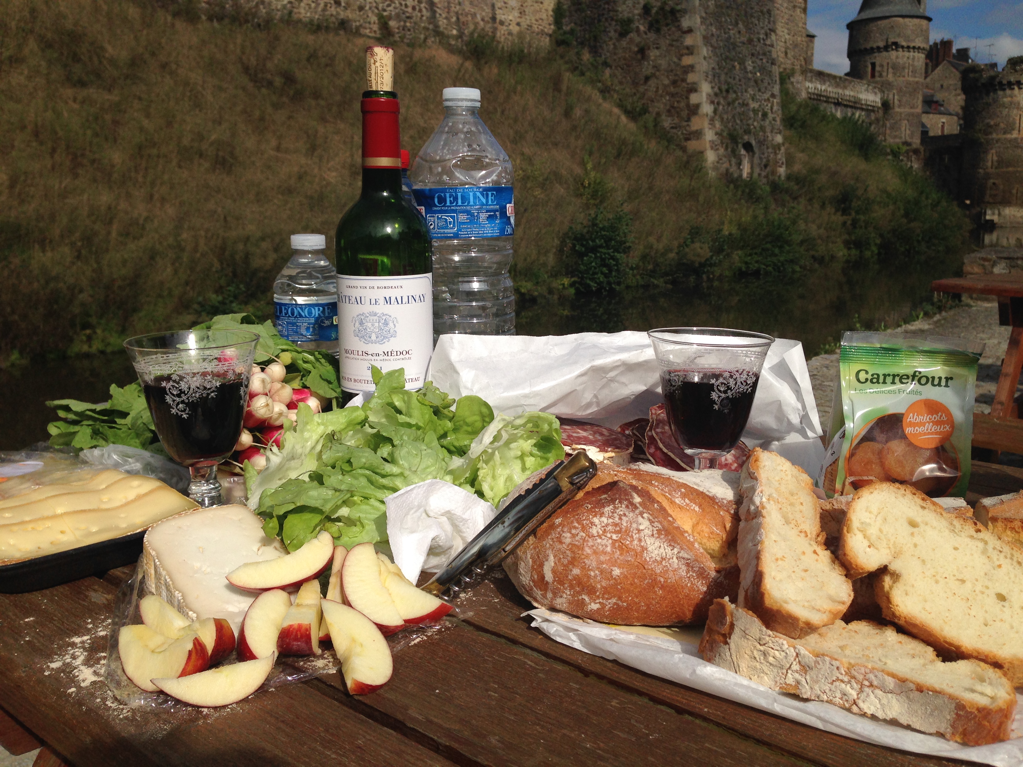 We hit the road, the long drive to Saint Emilion ahead with only our picnic to break up the trip. Oh, wait!! I almost forgot!! Selene also made a stop on the CHOCOLATE AISLE…we decided on chocolate with hazelnuts. 🙂 Hours later we stopped in the medieval town Fougeres, (grave accent over the first e but I can’t find it on my keyboard), finding the PERFECT picnic spot. Sunny day, castle, moat and a couple of vacant tables. Heaven!! We set up and jumped in. Good Lord, food never tasted so good!! I poured some of the bottled water over the lettuce to rinse off the dirt. Selene opened the wine and poured.