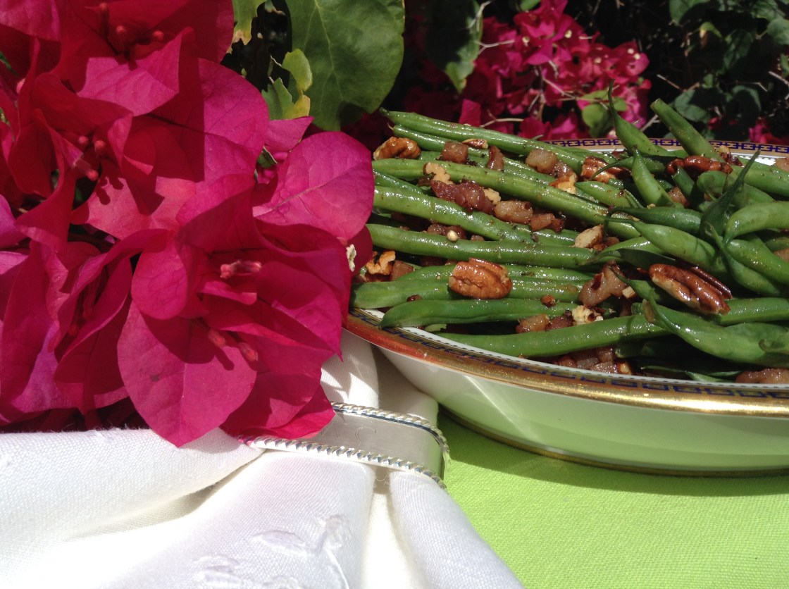 It’s the beginning of November, folks, and time to start thinking of Thanksgiving sides. I’m pretty traditional with what I serve these days. Many years ago I went through a very long phase of serving anything but the standard fare. One year was an Italian Thanksgiving, the next Puerto Rican and following that Italian. That was one FINE feast. I served a Vitello Tonnato that would make you lie down and weep it was so good. And the creamy, dreamy Tiramisu for dessert was celestial. You see, I don’t really like turkey. I’m just not a big fan except for the “oysters”, the large, oval pieces of meat which sit on both sides of the backbone. So I wasn’t exactly compelled to roast another  big, bland bird.  Or do that green-bean-mushroom-soup thing that ends up looking like barf.  Sorry, but it does.  And that thin, runny gravy with little fragments of chopped hard-boiled egg and liver covering MY mashed potatoes?  Not in this house.  Until the year when the mother of one of James’ friends asked him if he enjoyed Thanksgiving and Mama’s food which must be absolutely delicious? He didn’t realize it but I was within earshot. I waited for his response, a little smile started on my face in anticipation of the loving, complimentary answer from my first grader. “Yes”, he replied, “It’s always really good but I wish that at least one time we could have regular turkey and gravy and pumpkin pie”.  He almost sounded wistful verging on sad.  It was heartrending for me.  I thought, “Never again will I prepare anything for Thanksgiving that veers from the classic, time-honored American fare.”  And I haven’t!  Because nothing makes me happier than when my boy’s happy and I know many of y’all feel the saaaame way.  I’ll do it but I’ll do it my way.  And that would be with beaucoup flavor.  So let’s get on with my first side, French Green Beans, haricots verts, in brown butter, roasted pecans and tiny bits of salty, sautéed ham.  I like the french green beans better than the typical Blue Lake variety that are found at every grocery store in America.  The French ones have more flavor, they’re not watery and the end result is firmer.  Publix carries Haricot Vert and they even have their own brand.  I am NOT leading you down the path of ruin.  Try them out before hand and you’ll see for yourself.  They can be steamed right in the bag in the microwave and then lightly tossed with olive oil and garlic, a little salt and pepper and they’re delicious.  That’s what my friend, Jody, does and her kids gobble them up.  Yep.  Green beans. Sometimes I also saute a little shallot in the browned butter for further flavor.  This recipe allows you to prepare the dish in advance and then warm it just before serving.  And did I mention it’s really pretty on the table?  Oh, yeah.  It’s a Southern thing!