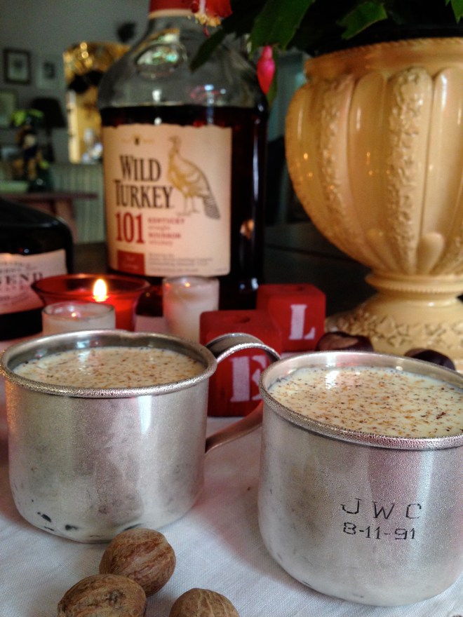 I saw my friend Harriet this week. We were Saint Anthony moms together back when James and her boy, Griffin, were in Pre-K. It was a long, long time ago. How nice it was to catch up! We don’t see each other that often but back in Pre-K it was one play date after another. They had such fun, those boys!! In and out of the pool, at parks they would go up and down the slide for hours, whatever they did they had a blast. Harriet and I had a good chuckle when we were chatting about one play date in particular. It was Christmas time and Griffin was coming over to play. The house was neat as a pin and whatever I had planned to serve for lunch was already set to go. I had polished and set out two special silver cups for the boys. James’ baby cup and my father’s, which had also been mine. James was excited because I had made a batch of homemade eggnog…minus the bourbon and rum since little folk would be drinking it. Lord, did that child love his eggnog. Still does! I have to admit I do, too. One year I gained SO much weight just on eggnog. I wasn’t working outside the home, James was still very young, so I had plenty of time in the kitchen. Well, I’d mix up a batch of eggnog, lace mine with bourbon and rum and then drink it. The mailman would be stuffing all the Christmas mail in the mailbox and I’d cheerily ask, “Would you like to have a cup of homemade eggnog with me?”. We’d stand by the gate and sip on our ‘nogs. I’d wait for the pool man to come so I’d have another excuse to have some. “Hey, Mike! How about a cup of eggnog?”, I’d ask while ladling it into the waiting cups. And I could always depend on my mom to have cocktail with me. She was ALWAYS up for an alcoholic bevo!! So beware. This stuff is good and lethal. I found it to be particularly hard to lose that weight, too. Anyway, back to James’ play date. The house was ready with the dining room table covered with styrofoam, glitter, sequins, jiggly eyes, pipe cleaners, glue, felt pieces, fake candy…all manner of crafts. I figured they could wind down after pool time with some Christmas crafts. Make some ugly-ass-but-we’ll-treasure them forever decorations. The morning went well. The boys were so sweet! Laughing and showing each other the latest addition to their ornament. And they were so happy!! I ladled the eggnog, all thick and rich, served it to them and left the dining room. I could hear their little voices, and little slurps interrupted by “This is SO good!” in those little people tones. A while later they both came to the kitchen their tiny tanned arms handing over the cups. James stepped forward. “Mama?”, he asked, “Griffin and I would like to know if we may have some more but do we have to have it in the tin cups?” TIN CUPS. TIN CUPS!!! Of course, they got more. And, of course, in the “tin” cups!