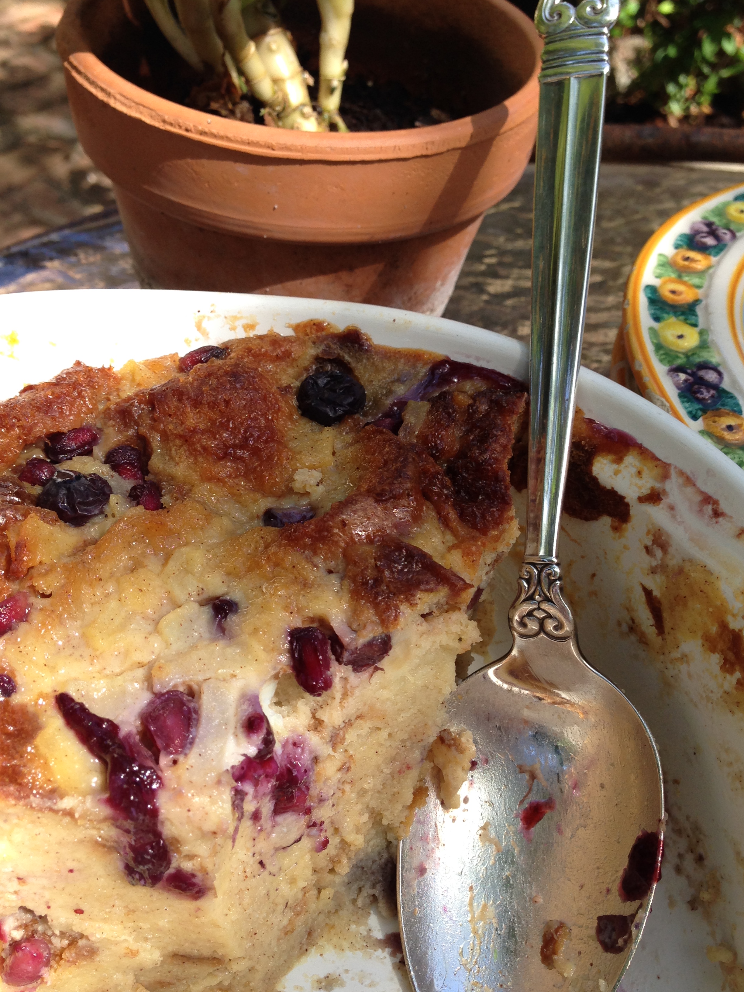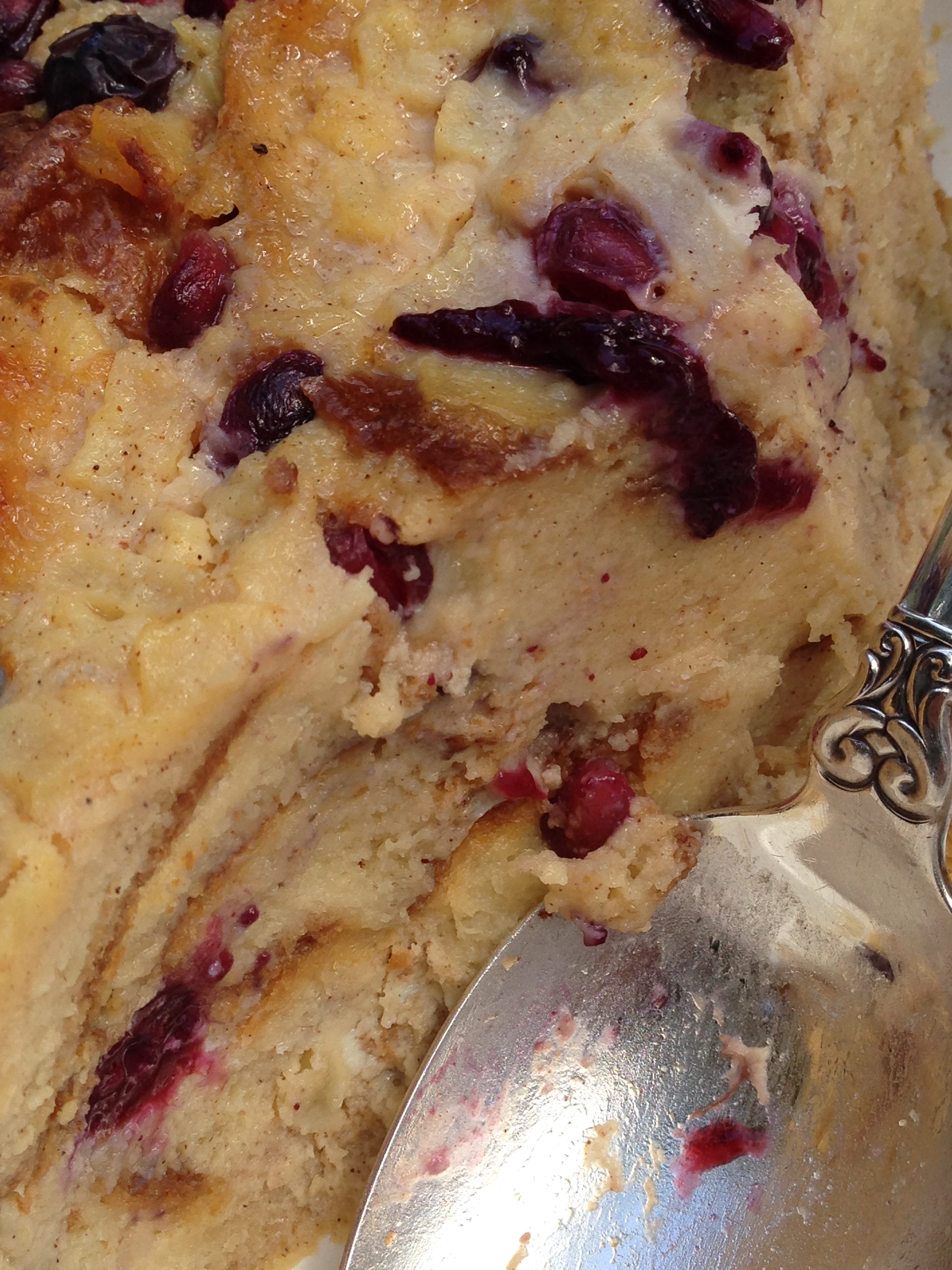 I find bread pudding simply grand. You can’t go wrong with it. You can’t. This recipe serves 10-12 people and, really, the big buy part would be the eggs and cream. It’s quite the luxurious bang you get out of your buck, though. The ultimate bread pudding is made with bread that has a good crust with a soft, light interior. One day old French bread or brioche is perfect. For this particular pudding I used a sweet brioche-like bread, King’s Hawaiian Round Loaf, which worked perfectly. You don’t want to use any bread that’s too heavy or dense nor would you want seeds but other than that you can mix and match your loaves. A stale, half loaf of soft whole wheat with five or six day old dinner rolls would be fine. You know what to do. I used blueberries, pears and pomegranate seeds for this pudding but feel free to use the fruits of your choice. The pomegranate seeds added a welcome tartness but not everyone will appreciate their crisp, chewiness. Throw in raspberries if you like. Or white chocolate shards. Candied pecans would be positively sublime as would naked, toasted, chopped pecans. The combinations are limitless. But the basic tenets of bread, eggs, cream, cinnamon and nutmeg are a heady mix when combined and slid into a hot oven. The perfume of a baking bread pudding will make you feel as though you’ve done your family a good turn. I got hugs and kisses from my boy James and I’m pretty sure they’ll be lining up in your house to give you thanks, too!