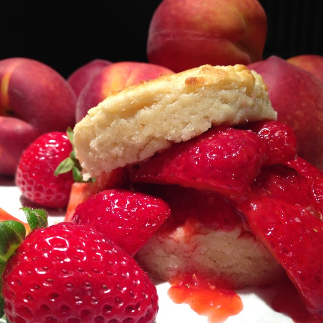 While your shortcake bakes and cools, hull and slice your strawberries. Or if you’re using fresh peaches slice them as well. Scatter a generous tablespoon of sugar over the fruit, stir it a bit so all the fruit is covered with the sugar and let it sit to release the fruit juices. Drizzle the sliced shortbread halves with that exquisite syrup. You’ll be sitting as pretty as those summer berries!