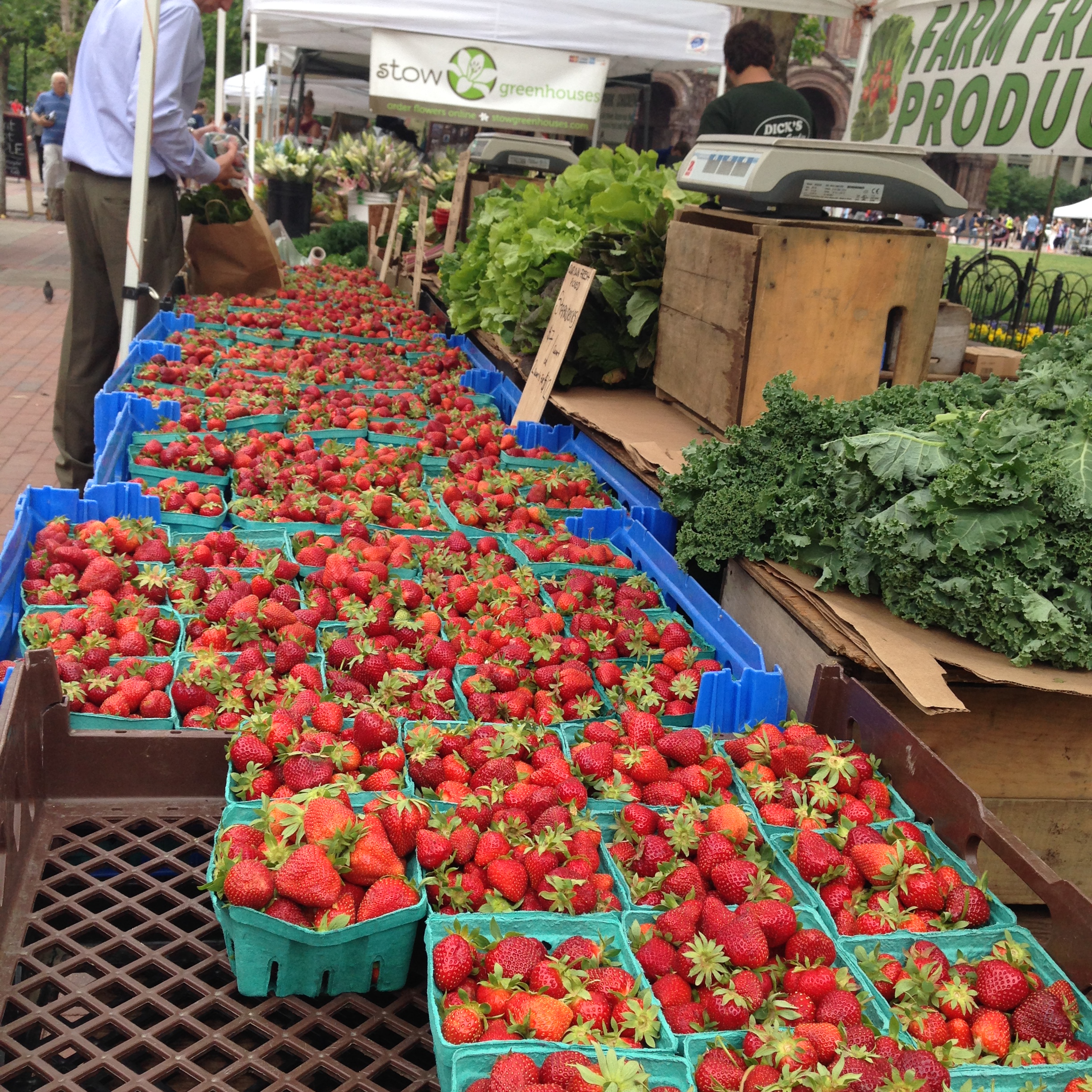 When I saw table after table stacked high with gorgeous strawberries at our farmer’s market I figured out it must be the season here in New England. Berries so deep red they were almost purple sparkled from every table and the perfume…well! The sun was shining, there was a soft breeze and everyone was outside on the square. For someone who likes to bang around the kitchen it was quite a heady combination. We don’t get this at home in Florida. Nope. Organic or conventional our berries are without flavor and dry. Pretty much suffice it to say when I saw these I was happier than a dead pig in sunshine.