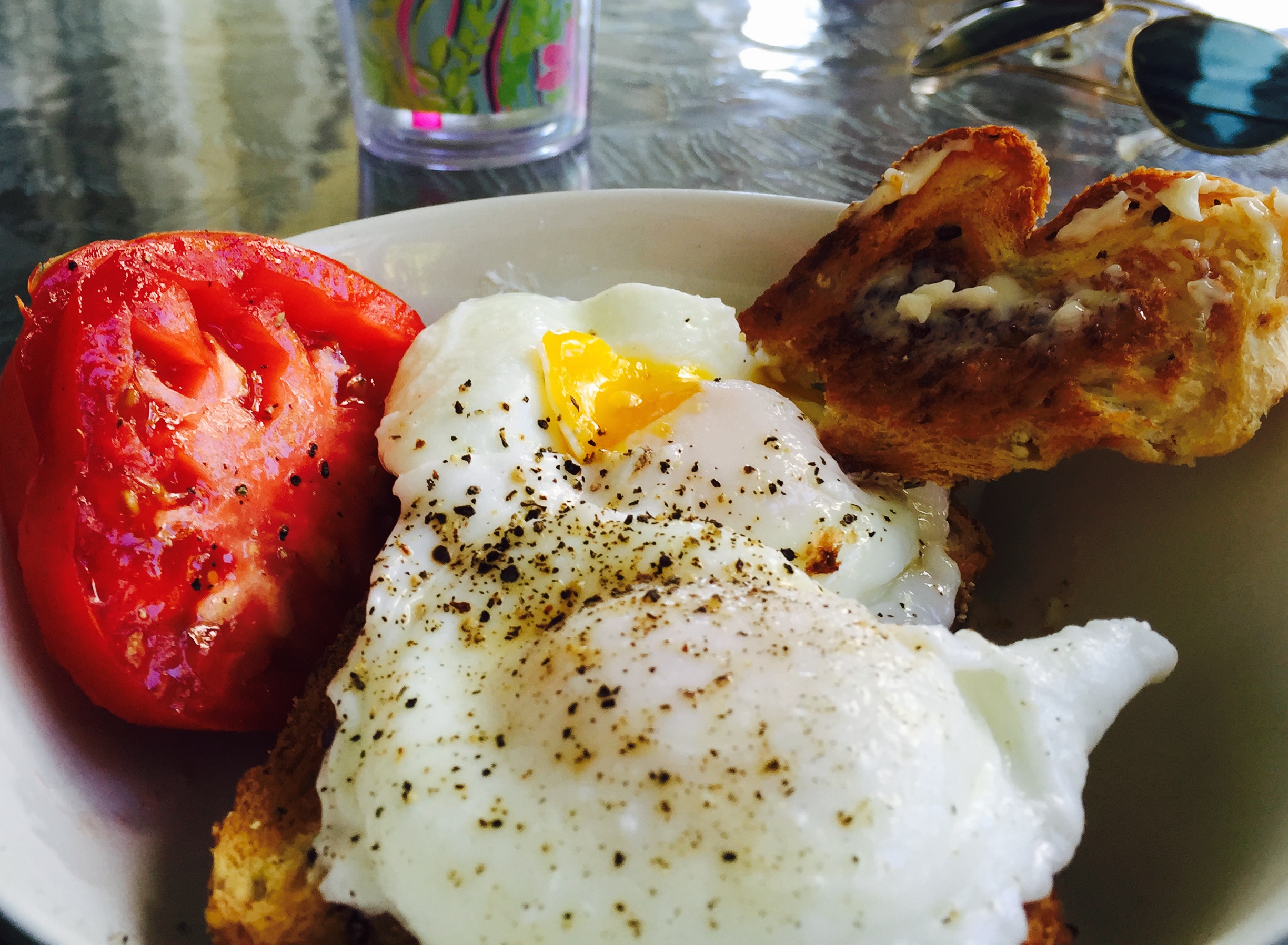 Yes, it’s that time of year again. When the three of us, Dana, Andrea and I head down to Hawks Cay for fun in the sun… a girl-cation. We’ve been going for five or six years now and we have our weekend down pat. When we first started going to the Keys we’d load the car up with our Vera Bradley bags almost bursting at the seams, stacks of pillows would take up most of the back seat and the stuffed trunk of the car barely closed crammed tightly with all our Publix provisions. Well, I’m here to tell you we’ve got this thing down to a science. We’ve streamlined and pared down to the essentials. Cases of wine and champagne and handles of vodka and rum now take room in the trunk. In small bags we each pack two bathing suits, (nobody likes to put on a wet one), two sarongs, (they can also double as towels), one loungy outfit, jammies and undergarments. Our travel outfits include flip-flops and, in the unlikely event we go out, the travel outfit would also serve as our party wear. But we never, EVER go out. We’re always too ripped. The three of us are early risers so by 8:00 a.m. we’ve had too much coffee, our suits and sarongs are on and the champagne has started flowing. And that’s when Andrea’s breakfast magic begins. The three of us love eggs, any way, any time. Being proficient and well trained girly-girls we want and expect a clean and lovely breakfast and my girl Andrea delivers. Poached organic eggs with nutty, toasted 7-grain bread to sop up the runny, velvety yolks and heirloom tomato slices to cut through the richness. Heaven! When one is going to be drinking in the sun, poolside, from say 9:00 a.m. to 4:00 or 5:00 p.m. one must have sustenance and a solid, healthful start. Poached eggs are fast, easy and a ripping good way to round out your first meal of the day.