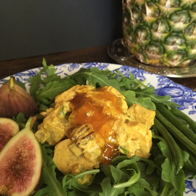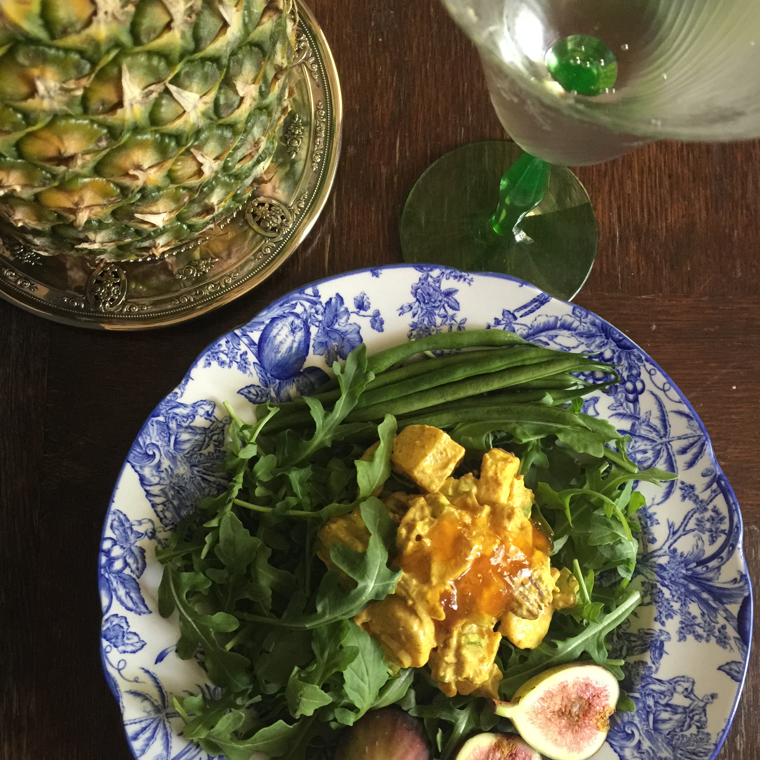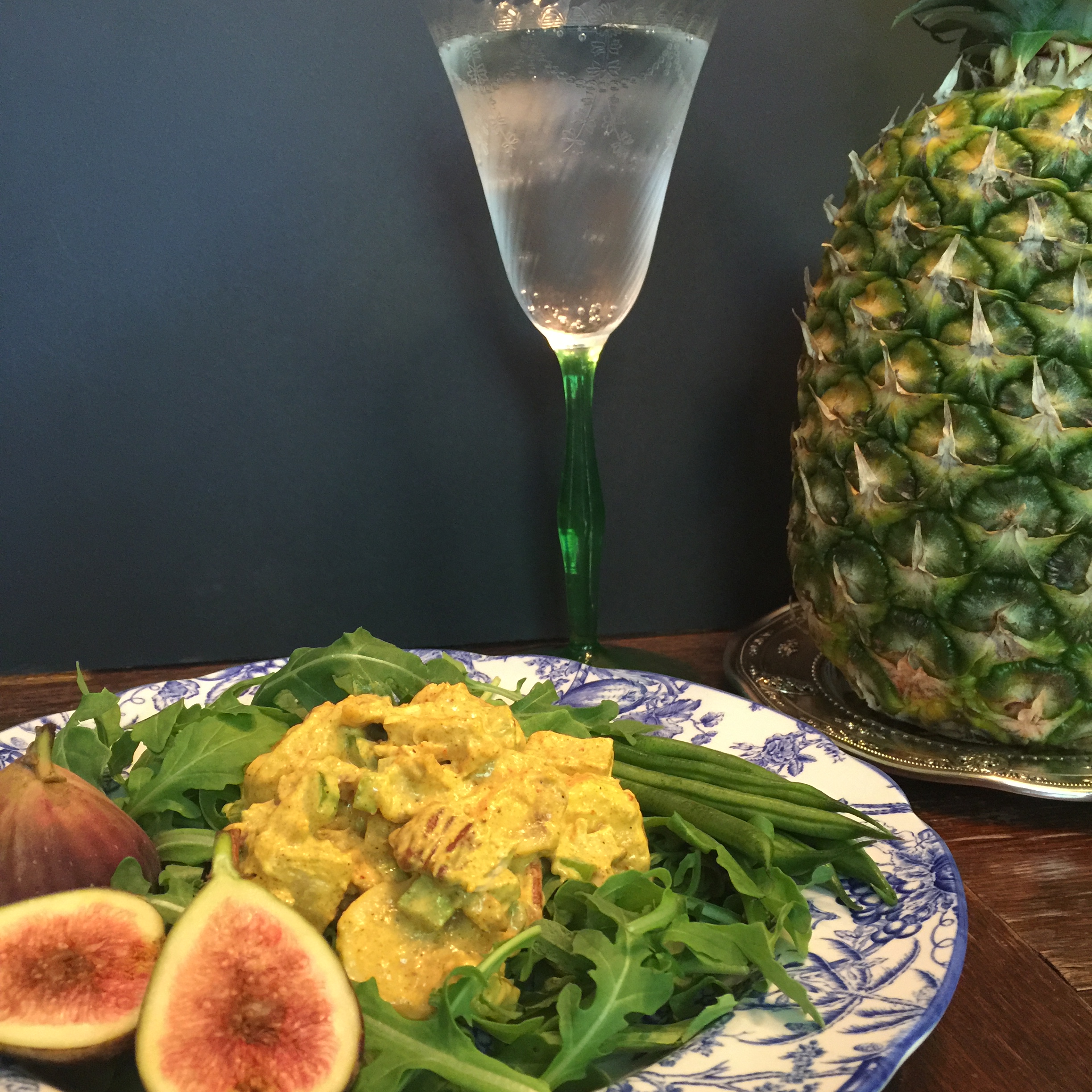 I was recently invited to help with a wedding shower for a sweet, sweet girl who also happens to be of the millennial generation. From what I’ve been told these young men and women are more than reluctant to entertain because they just don’t know how. I was fortunate in that my mother was all about the party and although she didn’t cook she was a great hostess, always in the know about the town’s premier caterers, florists and bartenders. Mama made certain we, my sisters and brother, all knew how to prep the house before a party, how to lay a table and how to arrange the flowers in every room. I am eternally thankful. Over the years I’ve built up a stable of no-fail recipes for all manner of get-togethers. Here in the South chicken salad is the queen of ladies luncheons, wedding and baby showers and lunch out with the girls. This curried chicken salad recipe is outstanding in flavor, ease and portability. It actually should be prepared one day in advance of serving thus freeing up more precious time. I’ve taken it to the Keys for Girl’s Weekend in a gallon size freezer bags and to friend’s houses in plastic quart containers for baby showers and funerals. I’m telling you, it travels well. The sweetness of the curry, pineapple and banana marry well with the savory flavors of the roasted chicken, celery and Greek yoghurt. There is a slight departure from the Southern chicken salad rule. In the South only white meat, the breast, is used. Thigh meat or any dark meat in this dish is considered downright trashy but I’m here to say that’s old school! I find solely using breast meat leaves your salad flat and lacking somewhat in flavor whereas the addition of dark meat gives an added richness and succulence. And by all means, take advantage of grocery store rotisserie chickens. Many a time I’ve used them and do they save time. I use my hands to pick off every bit of skin and and fat. If the grocery store birds are small you’ll need two. If large, one will suffice. Lordy, but it’s good. Whether or not you toast the pecans is strictly up to you. Toasted or untoasted, both yield a gorgeous flavor. A fat dollop of chutney on top is a lovely touch and won’t be unnoticed by your guests. I typically use whatever homemade I have on hand but on those occasions I’ve been without I use Crosse & Blackwell’s Hot Mango Chutney. It’s not really hot; in fact it’s barely spicy and the chutney needs to have a little backbone if you are going to include it in this dish. The salad may be plated on a bed of baby greens or as a sandwich on crunchy French bread. Along side some sliced fresh fruit and a handful of cold, lightly steamed haricot vert you will have a luncheon to be proud of!