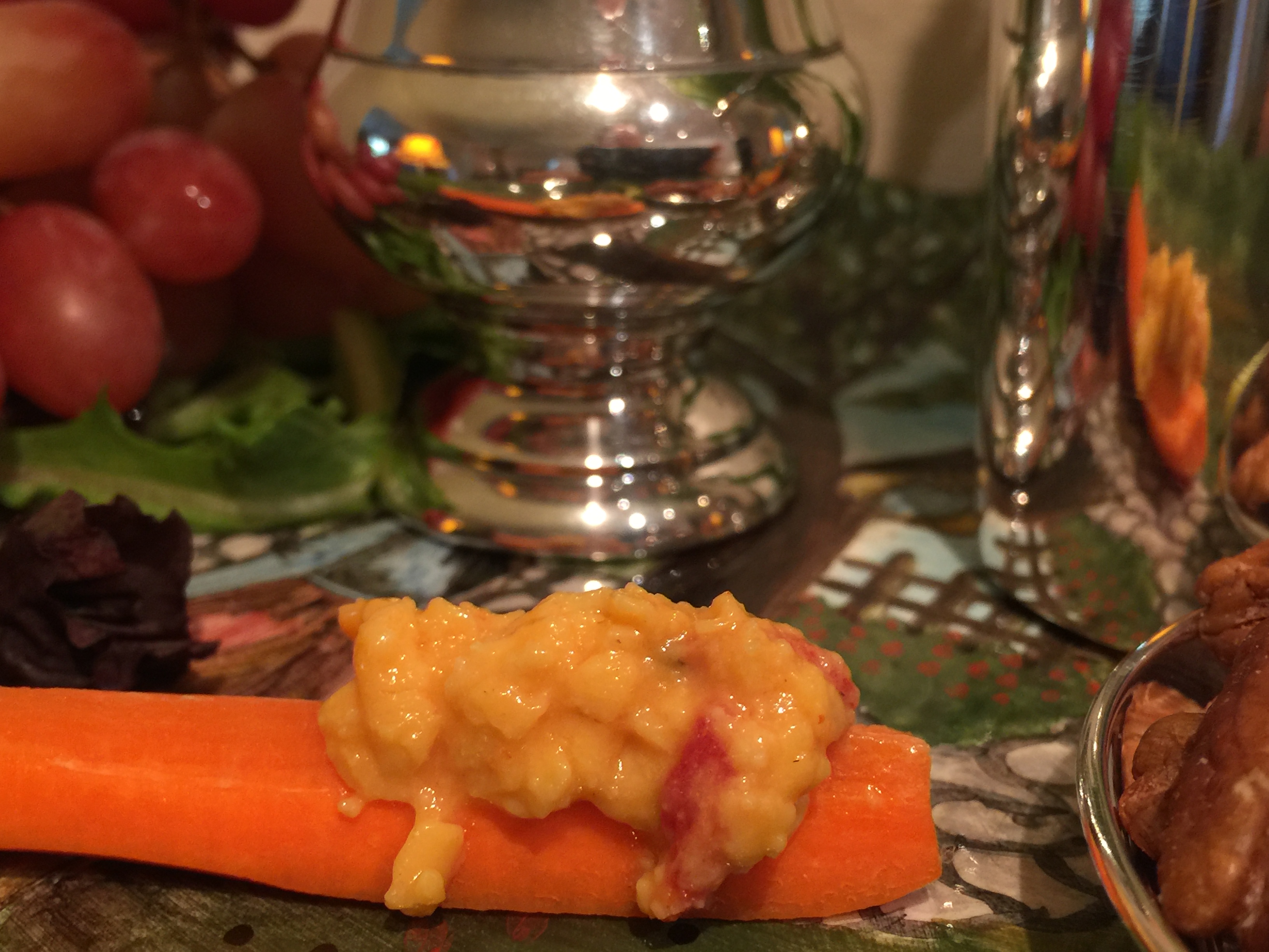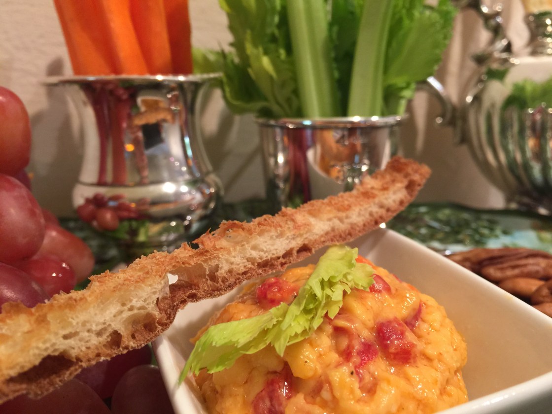 On our way to our rooms our footsteps echo reassuringly against the gleaming, burnished wood floors. All halls have original black and white photographs hung from the chair-rail up of visiting dignitaries, alumni and sports giants so captivating that Jimmy and I would take our cocktails and wander up and down passageways reading and exploring every once in a while exclaiming, “Oh, wow! Look at this! It’s Andy!”. That would be extended family member, (not really but we adore him), Andy Griffith of Mayberry fame. Literally hundreds of photos of presidents, civil rights leaders and movie stars all grace the walls and never cease to capture attention always making me late for which ever function we were expected. The suites were unfailingly enchanting showcasing the rich traditions of the gentile South. A tantalizing tray showcasing their sharp and spicy pimento cheese heightened by the addition of bread sticks, carrot and celery stalks, pecans and grapes. Sometimes drink coupons peeped out from a corner of the goody platter. The Carolina Inn pimento cheese, (known in the South as “puhmenuh cheese”), is some of the best I’ve ever had. Jimmy and I closed in on their offering like ducks on June bugs. Weary from travel, I closed my eyes and savored each and every bite. It was the perfect pick me up until dinner which would be hours later. Piquant, peppery and tangy this spread begs to be slathered on soft, fluffy bread or perched atop crunchy crudite accompanied by seasonal fruits and nuts. Hell, this stuff is fabulous alongside a bowl of crinkle cut potato chips.