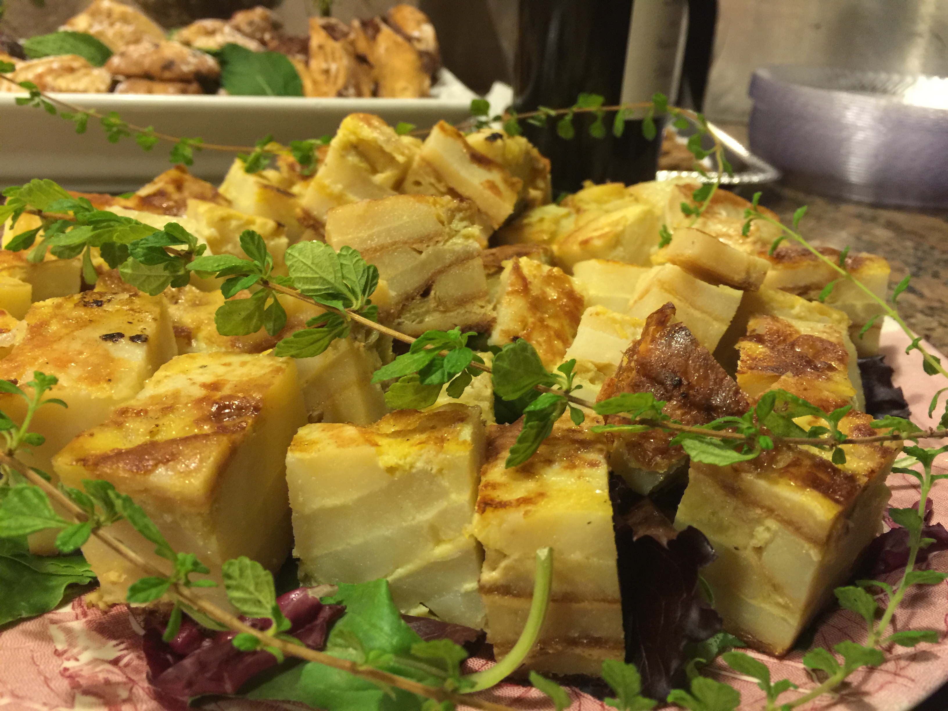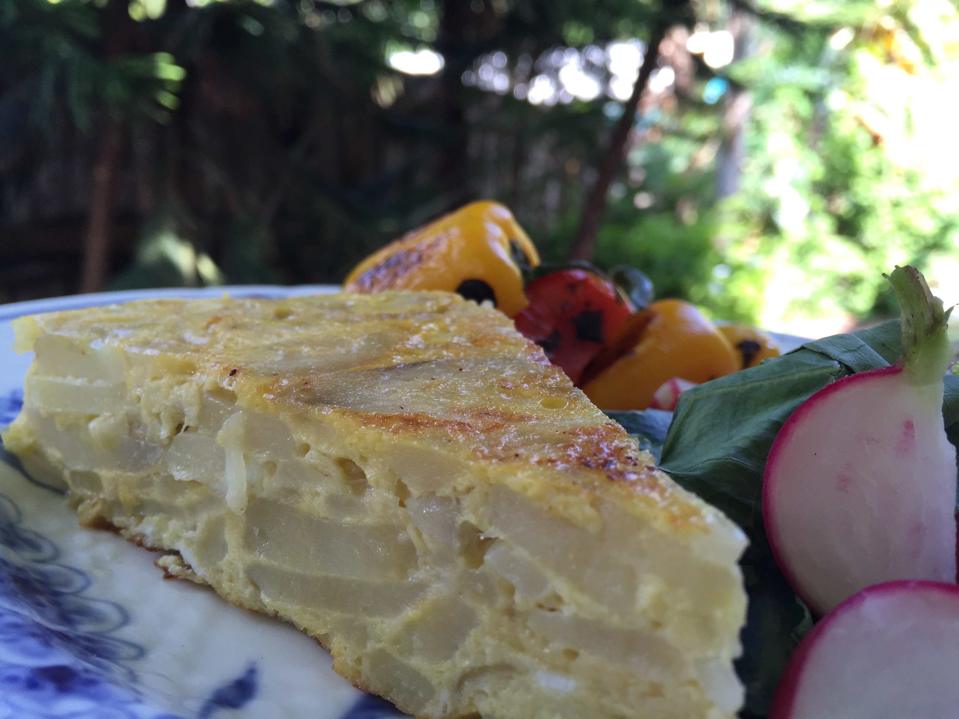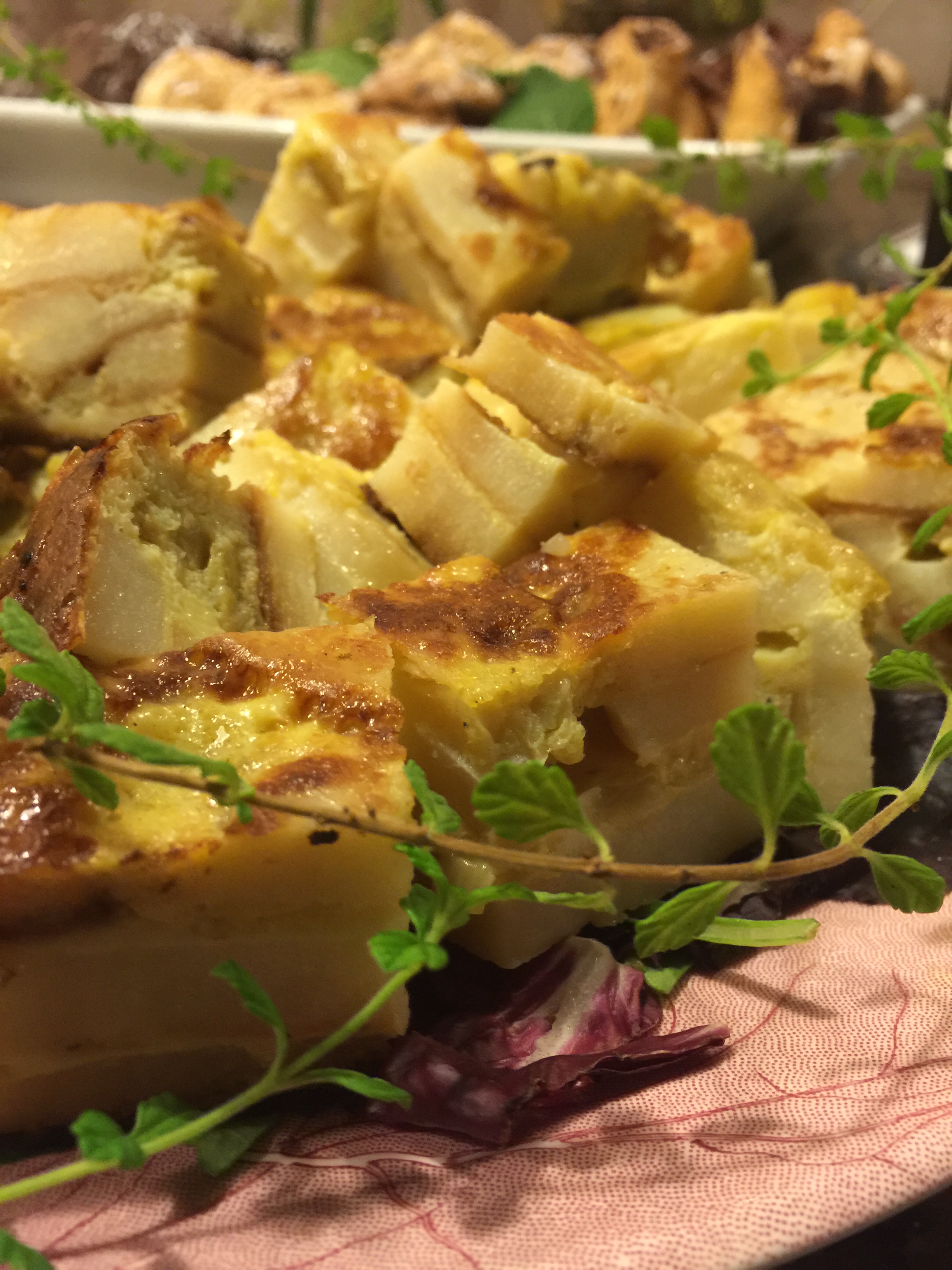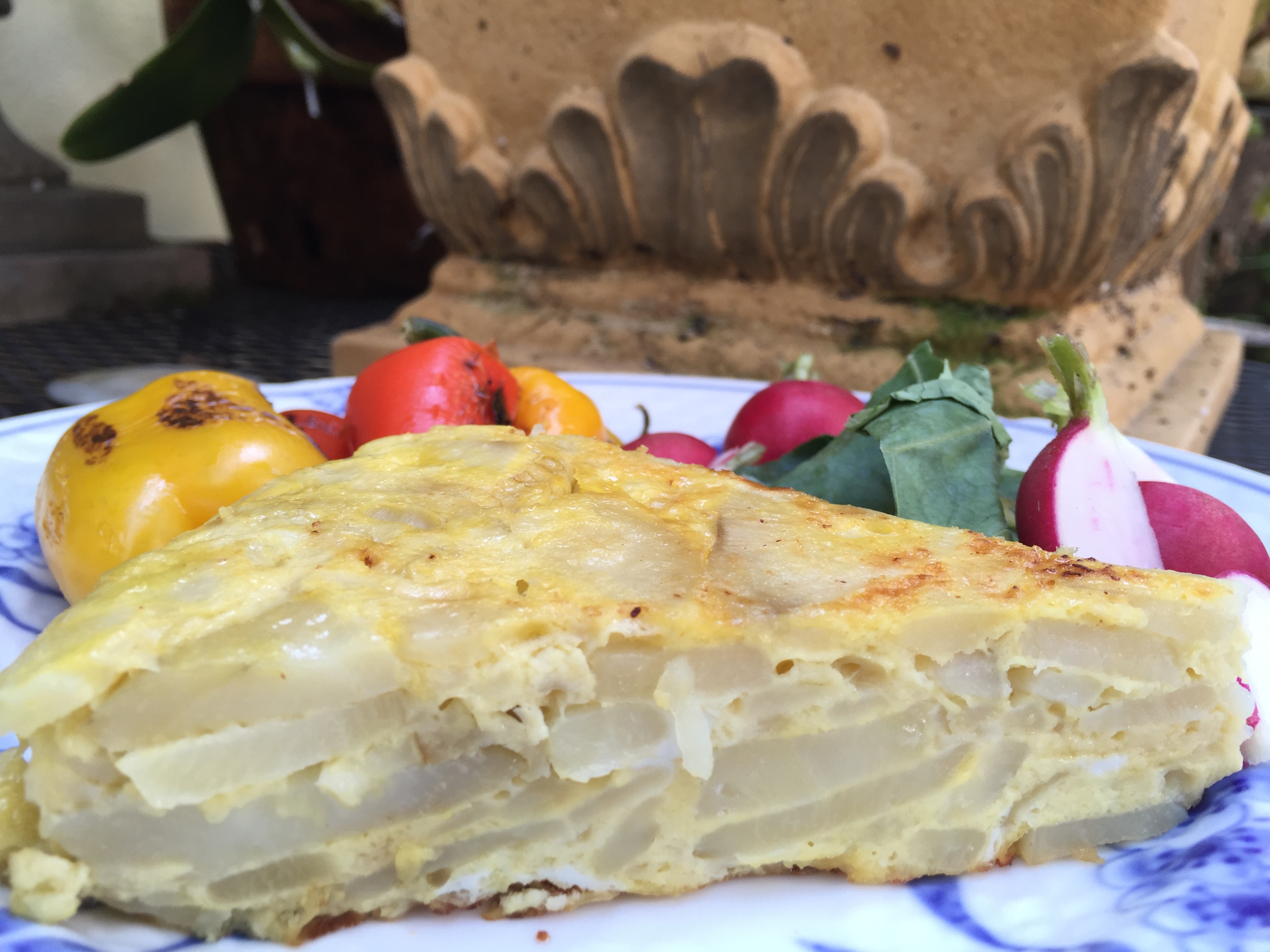 This dish, Tortilla Espanola, is absolutely beautiful. Perfect cut into squares and served with cocktails this torta will also segue easily into brunch as well as a hastily cut slice eaten on the run. It is the traditional tapas served throughout Spain and other Latin locales. I don’t consider the American equivalent of the tortilla as being an omelette because I find omelettes are more egg than any other ingredient. In a torta the egg is more of a binder. Also the tortilla is cooked slowly rendering the potatoes soft and almost gooey in texture; the onions melt into the mixture but their flavor remains smooth and sweet. The following recipe is the classic Spanish version of just four ingredients; potatoes, onions, olive oil and eggs. But feel free to add peppers, mushrooms, sausage or herbs. Every recipe is different and individual so there really is no right or wrong way. Please don’t be put off by the “flipping” or inverting procedure of the torta from pan to plate and back. Just use a large, flat platter that feels good in your hand, take your time and invert the tortilla over your sink. Cook the tortilla slowly and resist the temptation to jack up the heat. Medium-low is the ideal temperature throughout the cooking process. If time allows, prepare the dish the day before you plan to serve it to give it sufficient time for the flavors to marry and also to get good and cold. If you decide to prepare this recipe again, strain the olive oil, pour it into a glass jar fitted with a tight lid and store it in the refrigerator. This oil can be used again and again for tortas and the flavor of the oil will make your tortilla taste better and better with each use. Finally, and I can’t stress this enough, definitely use a nonstick pan otherwise your beautiful torta will stick to the pan and fall apart. Buen Provecho!