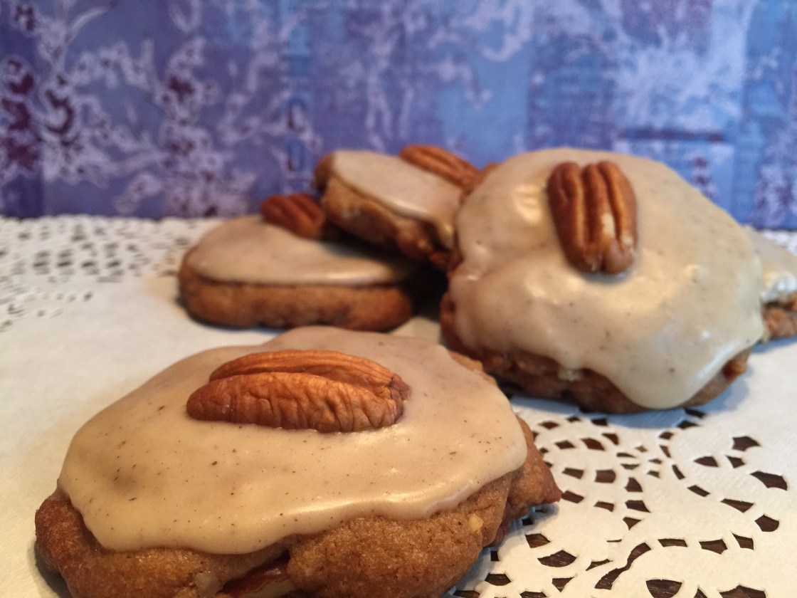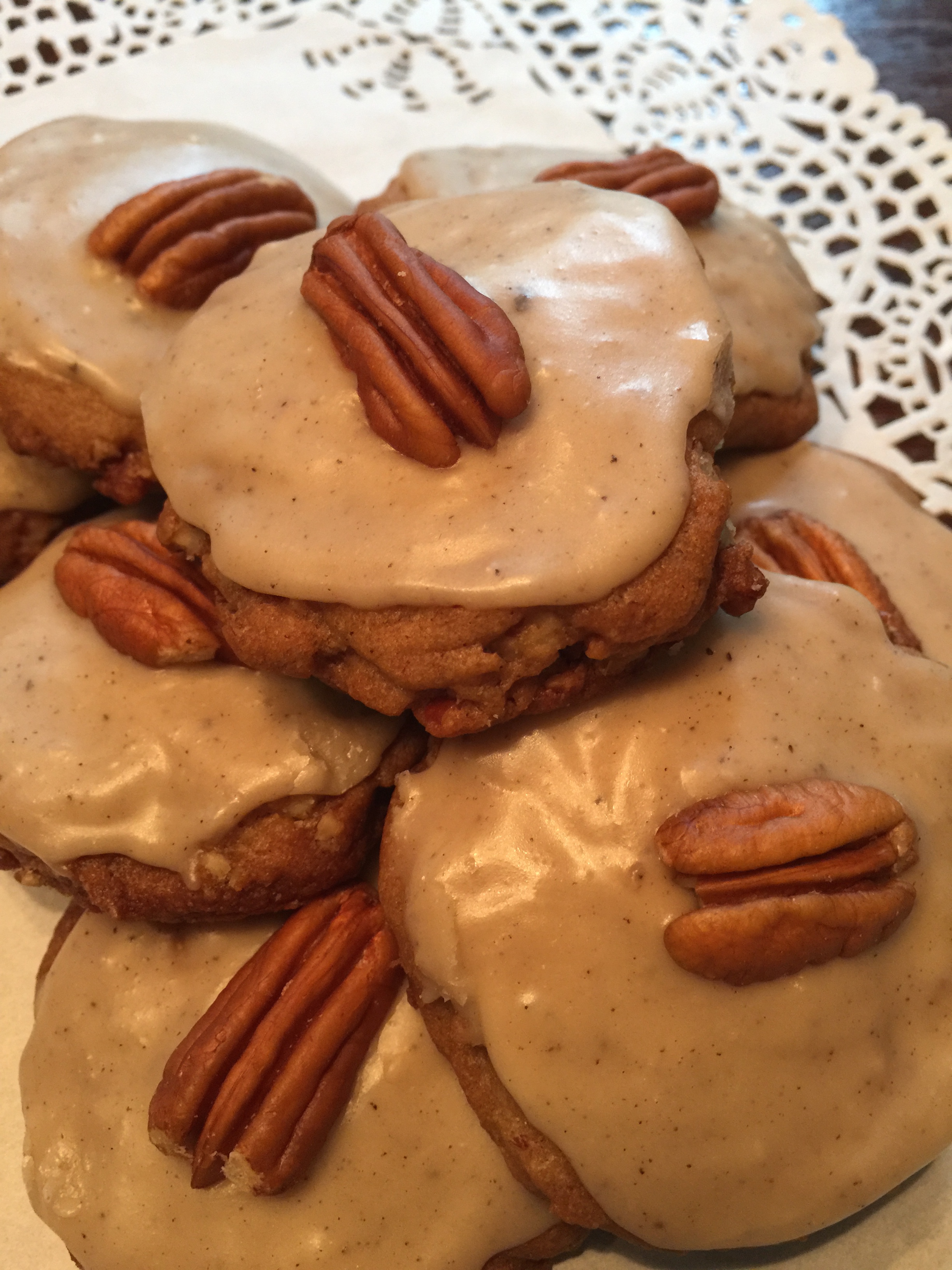 Early to bed, early to rise.  I am an early riser.  Often I awaken in darkness and have some version of the following conversation with myself.  “If I get up now I can pull some butter and cream cheese out of the refrigerator to soften on the counter while I have my coffee.  Am I going to even use the butter and cream cheese?  And I can look through some cookbooks for inspiration.  Do I have any eggs?  What was it I ran out of and was supposed to get at the store?  Did I remember to get it?”  Wide awake I grab the clock to learn it’s 4:17 in the morning.  Ugh.  I lie in bed as long as I can and then that’s it.  I have to get up…have to.  It’s still too early to wake the household with my banging about, but I WILL quietly pad to the kitchen, prepare the morning coffee and mull over what it is I want to cook or bake.  The morning is deliciously dark, the kitchen hushed and still.  It is an exquisite peace, well worth leaving 1200 thread count sheets.  No phones ringing, no dog barking, too early for music, my thoughts silently bounce around my noggin with the speed of a crazy ball.  This morning I focused on pecans.  And butter.  Brown butter.  And cookies.  With a glaze.  More brown butter.  Rum?  Uh-uh…too harsh.  Bourbon, yeah, bourbon.  A bourbon and brown butter glaze.  Bingo.  I know what I want to do with the morning.  Pecans mean autumn to me as does brown butter.  I pull out books, pens, recipes and notebooks.  My coffee sits on the window sill of the kitchen as I settle into the window box to sip and see what I can come up with.  I know everyone’s excited about pumpkin right now but I just can’t.  I’m sorry.  I’m already over and done with all the pumpkin.  Pumpkin lattes, coffee cake, Rice Krispy treats, cinnamon rolls and snickerdoodles.  Maybe sometime I’ll bake off some pumpkin bread but that’s it for pumpkin.  Maybe some soup, too.  However, pecans?  Georgia pecans?  Oh, hell yes.  Pecans say college ball, the occasional lit fireplace, short days and cool nights.  Pecans say gumbo parties, your favorite boots, cashmere, apples and no bad hair days.  The result of all this is a cookie that will blow your cozy, autumnal socks off.  The glaze is not at all boozy but a warm, soft blanket of icing with the deep, smooth flavor of butter hinting towards bourbon .  The cookie is ever so slightly crisp at the edge becoming chewy, salty and buttery with the joyous meeting of sweet pecan to tastebud.  Good Lord, but they were good!  I say were because I had to get them out of the house.  Too much temptation for this girl.