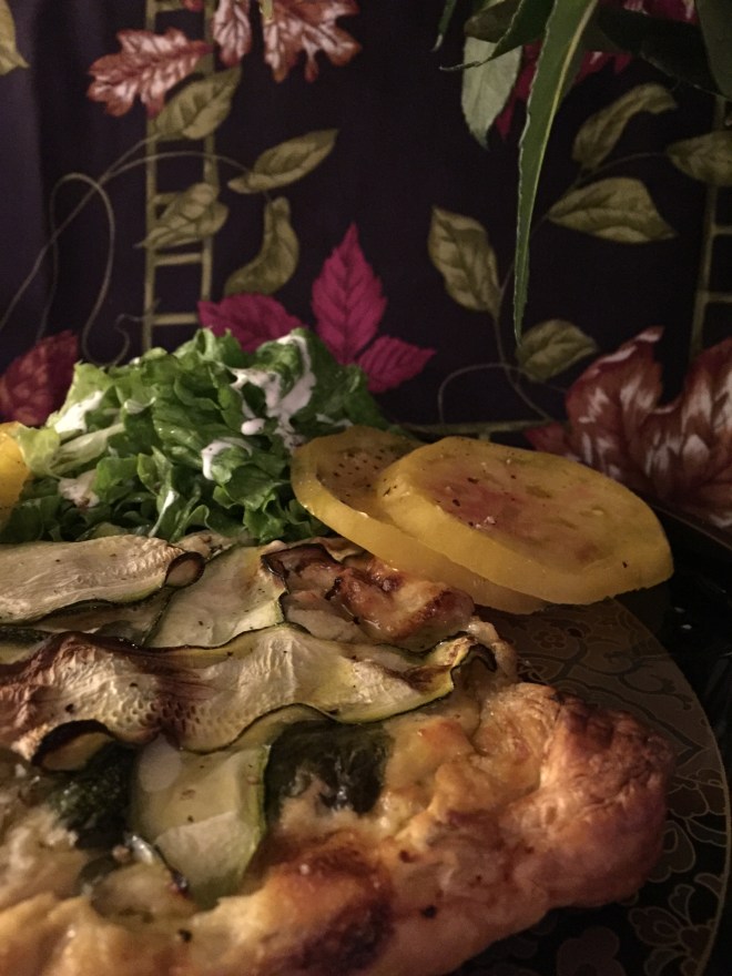 There’s not much better on a Friday evening than mouth-watering, delectable dinner that’s put together with ingredients you happen to have on hand. Having discovered some time ago goat brie at Trader Joe’s, I thought maybe I would incorporate it into some sort of puff pastry tart for dinner. Looks like any brie but this one has a strong, goaty flavor that’s positively sublime, and, yes, now I am an addict. If you’re not able to locate it, the combination of a small wheel of brie chopped and mixed a small amount of chevre, goat cheese, will also work quite well. I wanted a creamy backdrop to support the brie and one small container of ricotta was the perfect foil, rich and spreadable but not as gooey as mozzarella. An egg to bind, some fresh basil, zucchini ribbons, a quick drizzle of a fragrant, green olive oil and I had one gorgeous, undemanding dinner. The only fly in the ointment was neither of my boys had gotten home yet. Jimmy was speaking at some conference and James catching up with a co-worker he had worked with on a gubernatorial campaign. All fine and well but, hey, dinner’s ready! I chased away the feeling of discouragement by serving myself the prettiest part of the tart. Cut into quarters, my portion had the most browned, runny, chewy bits of cheese. Not exactly first prize but I’ll take second prize any day. I had prepared a splendid salad of leaf lettuce dressed lightly with creme fraiche; the requisite glass of Malbec had been poured. Each bite was a song of flavors. The buttery puff pastry gave a satisfying crunch as did the barely cooked zucchini. But the goat cheese was the star of that musical. Not too sharp and creamy-dreamy, the brie made its presence known in every bite. Happy Friday night to me!