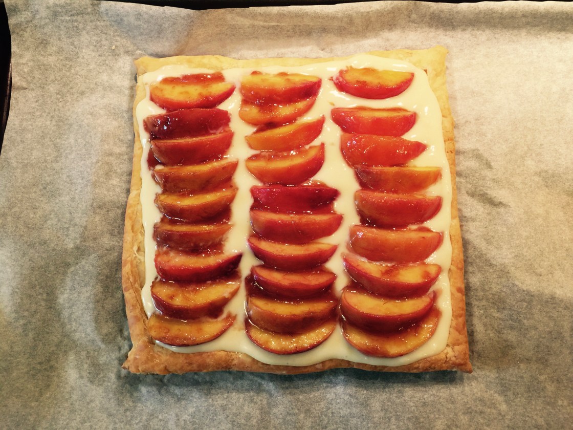 Father’s Day is day after tomorrow and we’ll be celebrating with this gorgeous summer tart. My husband, Jim, is a vanilla man. Any way, shape or form; cream, vanilla and butter rule in his kingdom. So the chocolate fudge cake I was going to bake? Out the window. It’s his day, not mine, therefore I’ll give him what he craves. Creamy, vanilla pastry cream generously spread over a pillow of buttery puff pastry and topped with perfectly ripe, juicy Georgia peaches. This is an easy one, people. The pastry cream is a snap to make but if you really want to take the easy way out, and sometimes we all do!, a quick batch of boxed pudding mix will work fine. It won’t have the depth and richness of homemade pastry cream but sometimes that just has to do. The puff pastry comes frozen from the grocery store and requires defrosting in the refrigerator. The peaches must be unblemished and perfectly ripe. The skin is taken off them for the topping therefore it’s best to blanche them for 10 seconds rather than peel them so that you’ll finish with a handful of beautiful, slippery peaches as opposed to raggedy, torn up orbs. Any pieces of fruit left over can be thrown in the blender with your other margarita ingredients, also perfect for Father’s Day. Hope everyone has a great one!