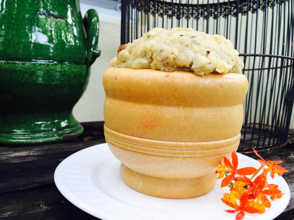 In Puerto Rico mofongo is typically served heaped to overflowing in an individual mortar. How handy!
