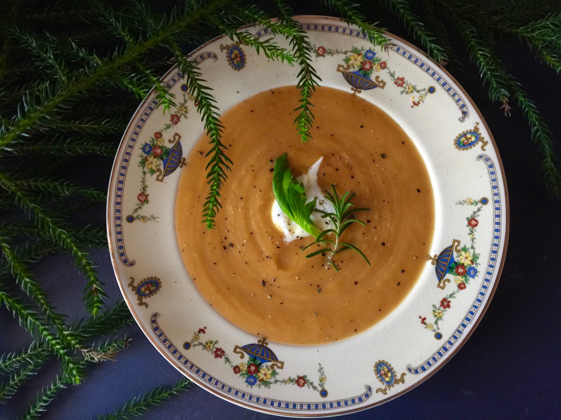 I had to make room in my hateful, miniscule, dorm-room size refrigerator for the 25-pound turkey, the 10-pound spiral cut ham and all the trimmings that go with Thanksgiving dinner. On a mission, I threw out THREE, count ’em, three, opened jars of Greek pistachio spoon sweets in syrup. Keeping one, the thought occurred to me, “Really? Who needs four OPEN jars of that ambrosial stuff?” Into the trash went an enormous, almost empty jar of jalapenos in brine, four lonely slices sloshing around the glass. I found an unopened jar of that fabulous jar of fig in red wine jam I made a month or two ago. I set in on the counter…in the maybe section. The plastic container filled with obsidian green spinach, dark and glossy with olive oil and sautéed garlic…out you go. And then I discovered the leftover butternut squash I had roasted several nights ago. It was gorgeous and I knew I couldn’t part with it. I had run into my friend, Brooke, at Michael’s Craft Store the other day and after laughing and chewing over our personal problems, our children’s problems and our career problems we moved on to discussing dinner. She asked me if I had a good recipe for roasted butternut soup. “No”, I answered, “I don’t. Every recipe I’ve tried has always been a significant disappointment. Why, do you??” She did not. Today I figured I’d come up with my version of a roasted butternut soup that would make me swoon with culinary delight whether it be hot, warm or cold. I was determined to make those leftovers work for me. I pulled out every cookbook and recipe I had. I didn’t want a soup strong with the flavors of ginger, cinnamon or cumin. No. I wanted a French-style soup that had the sweet yet savory flavor that butternut squash can be coaxed to share. You know. The kind of flavor you get in a $14.00 cup lunching at some stellar museum restaurant. Well! This is it. Silky smooth, it is noting short of perfection. That bowl that’s in the photos? I gobbled it down. You will love this winter soup. The squash may be roasted specifically for the soup or you can use your leftovers. It can be pureed with an immersion stick blender, (that’s what I use), a food processor or a traditional blender. It’s beautiful. Enjoy!