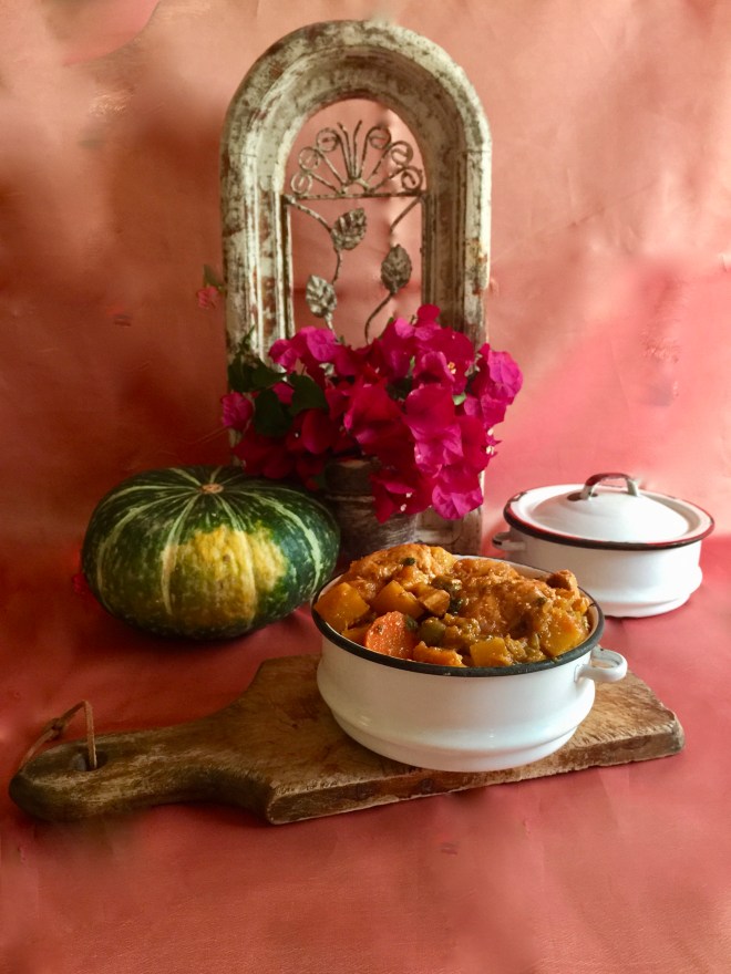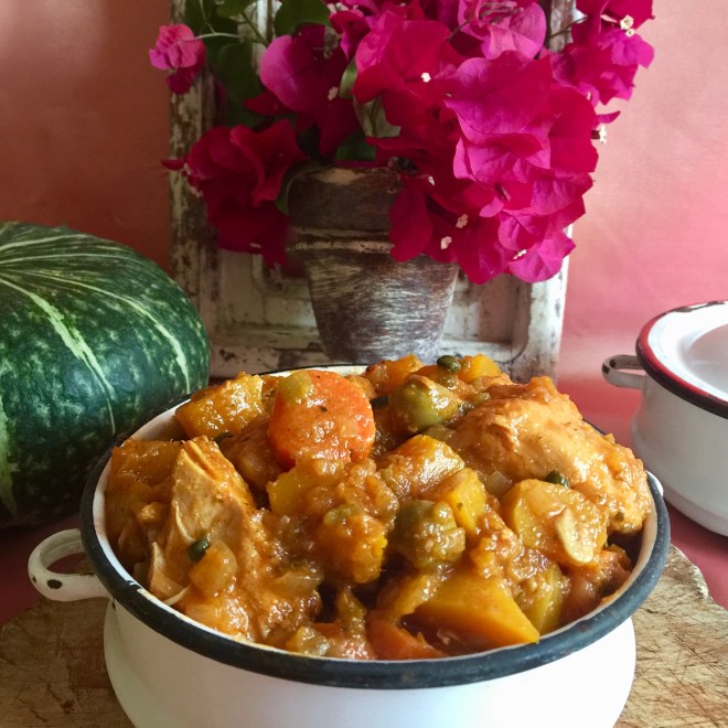 This stew could be served alone it is that hearty. With the addition of potatoes and/or pumpkin it is a complete meal. Both white meat and dark meat work well in this dish, however, if white meat is used make certain the stew never heats up to more than a simmer. A healthy, boiling pot will guarantee dry, tough meat. I take the skin off of all the pieces of chicken because the skin becomes incredibly unappealing after having been simmered in the sauce. I usually prepare boneless chicken as it can be difficult to maneuver around a slippery bone with a fork and knife, however in Puerto Rico you will only find this dish bone in. The cup of sofrito called for in the recipe is necessary for a spectacular result so make sure you don’t leave it out. A seasoning blend of onion, garlic, bell pepper and culantro, it can be bought in the international section of your grocery store but better would be home-made. Sofrito freezes beautifully so make a big batch, portion it out, throw it in the freezer and you’ll always have if for your Caribbean recipes. That recipe can be found at http://wp.me/s264J2-sofrito and is easy as can be. If your family isn’t wild about olives they may be left out. I try to find green olives with the pits still in as I think they add more flavor to the recipe. Please don’t feel you have to use your best bottle of wine, either. Jimmy went out and spent $7.00 on a bottle of Pinot Grigio, it was perfect and didn’t break the bank.