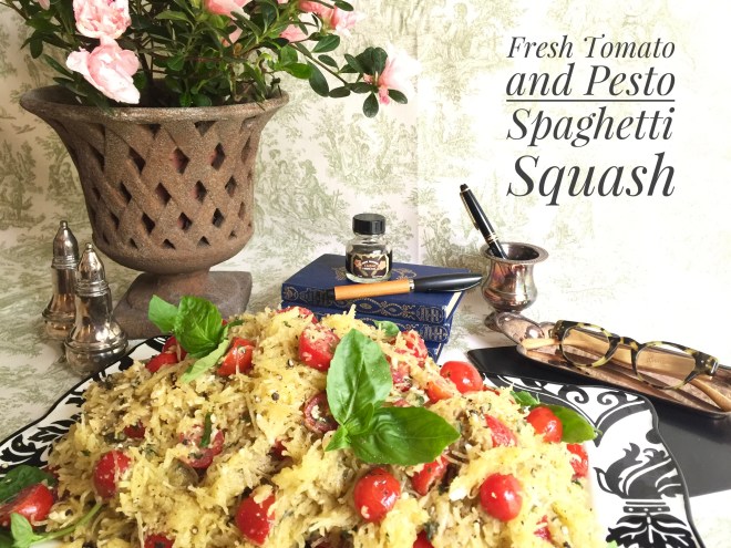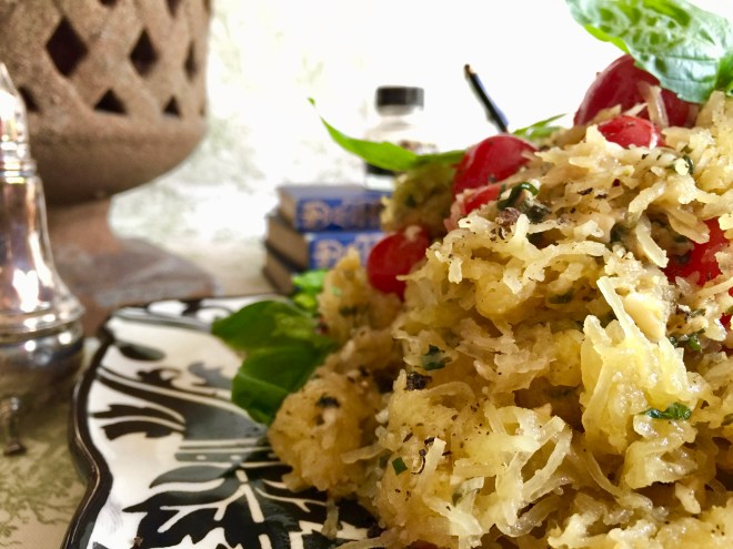Here we are in March…in like a lion, out like a lamb.  In south Florida we are most definitely enjoying lamb-like weather.  Jimmy and I are found in the courtyard often, reading and writing, the dog typically sprawled at our feet.  Jimmy will spend his mornings outside working on his laptop, leisurely smoking his pipe which, by the way, smells positively heavenly.  We read the New York Times in the morning and take pleasure in a simple happy hour or dinner in the evening.  Clearly the mosquitos haven’t found our house yet…but they will.  In the meantime, if it’s morning or evening, assume we’re puttering outside.  This dish is a spring and summer joy.  Simple and healthful, it may be served as a vegetable side dish or as an entree with a piece of grilled tuna or chicken atop.  It’s lovely at a picnic or poolside as it travels extremely well.  Spaghetti squash is much lighter than pasta and undeniably lower in calories.  Those who are allergic to wheat will love this alternative.  No more sneezing and itchy eye!  Regardless of your reason to try this dish, I think you’ll truly enjoy it and so will your family.