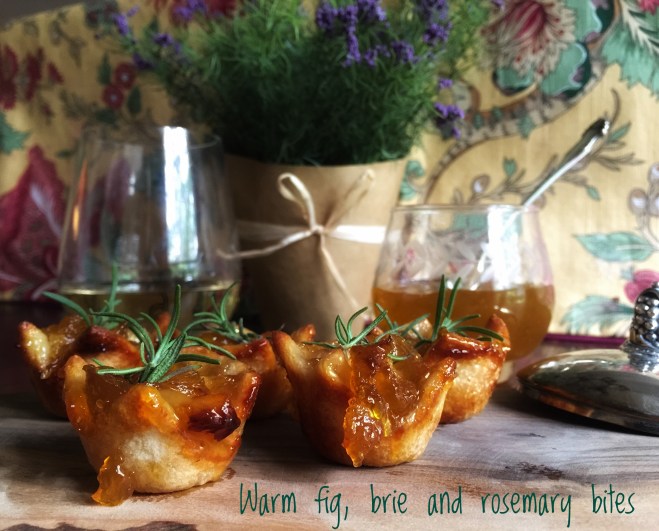 Hey, y’all! I’m going straight into this recipe without chit-chatting about having James home this weekend and getting to smother him and cook for him because he was sick with a cold nor will I regale you with details of the Miami Book Fair because I want you to have plenty of time to get your menu together for Thanksgiving. These warm and gooey appetizers are the perfect combination of sweet and savory but the best part is the dough is already made, rolled out and waiting for you in the dairy section of your grocery store. I found a new product by a company I NEVER use, Pillsbury, at the store and thought I’d try it out. Pillsbury now makes a thin and a thick pizza dough, rolled up and on parchment paper in a plastic tube alongside the boxed pie shells. I used the thin dough and it was terrific in that the dough is sturdy enough to hold the heavy cubes of cheese and fig jam unlike phyllo which seemed to always fall apart on me. The mini-bites may be assembled the night prior to baking if kept chilled in the refrigerator. Try to find a ripe piece of brie to play up its flavor. If the cheese isn’t fully developed the taste, the character, will get lost in the fig preserves. Which isn’t a bad thing…I mean, who doesn’t love figs?! And that gets me to the figs. This recipe calls for a jar of fig jam, no fresh figs to be cut. Gosh, but I love this receipt. The dough is cut into squares with a ruler and a pizza cutter and the cheese is cubed. The fig jam is already prepared and the fresh rosemary leaves, waiting in the produce department, are either pinched or clipped off the stalk. Oh, so easy peasy. Happy Thanksgiving, y’all!