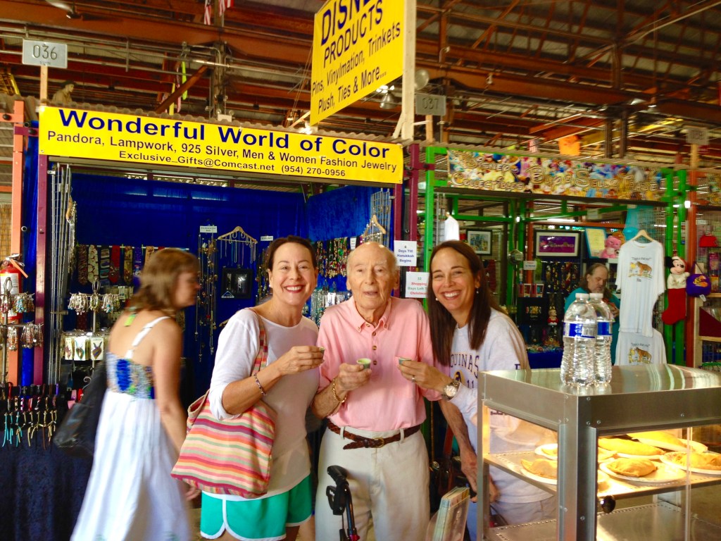 Dad, my younger sister, Pamela and me at a fabulous farmer’s market we found. The photo was taken in 2013 when Dad was full of spit and vinegar. We each have a shot of wheat grass in our hands followed by water chasers on the counter. Go Daddy!