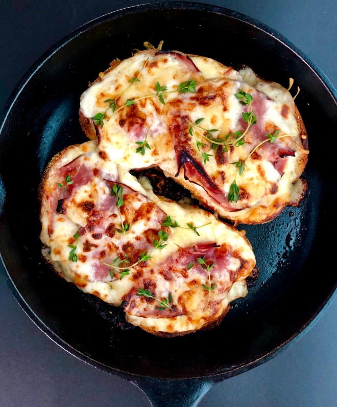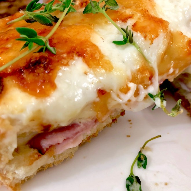 Mama NEVER made this sandwich but we did enjoy quite a few in Paris.  The croque monsieur may be made open face or with two slices of bread.  It can be assembled in advance and then popped into the oven prior to serving.  The best bread seems to be a country-style bread which one would think would fall apart with the weight of the ingredients but lightly toasting the bread before assembling the sandwich eliminates that problem.  Typically the sandwich is not served with fresh thyme to garnish but it adds such a delightful flavor I urge you to try it.  And I strongly suggest grating fresh nutmeg into the bechamel.  Makes all the difference in the world.  This sandwich pairs beautifully when served with an arugula salad dressed with a lemony vinaigrette.