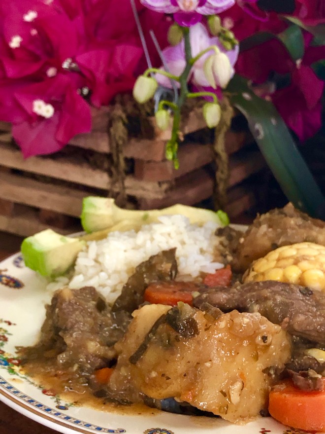 The following is my recipe for a Puerto Rican stew called sancocho.  Sancocho is found all through the Hispanic Caribbean, Central and South America.  Although every household seems to have its own version I have NEVER met a sancocho I didn’t love.  It calls for a variety of root vegetables among other ingredients and can be prepared with beef, pork, chicken, fish or a combination of the before mentioned.  Sancocho is hearty, comfort food at its best.  In Puerto Rico it is served with a side of perfectly prepared rice and three or four slices of fresh avocado.  If you prefer a thick stew, remove a few chunks of vegetables from the pot, give them a quick mash and throw them back into the pot.  For a soupier end product, add more broth.  Please note this recipe reflects a thicker version as that is my preference.