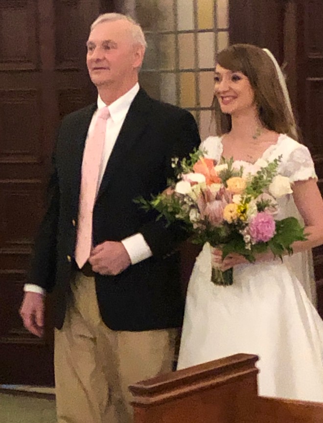 The bride, Elizabeth, was beautiful! And the groom was dashing and so happy! Can one be any happier? Emotions were running high. I was so proud of myself in that I didn’t cry. I didn’t want to miss one second of anything because my eyes were filled with tears. And the music…oh, my word! All of Elizabeth’s favorites were played for the entrance procession including Bach’s Jesu, Joy of Man’s Desiring and the Arioso from Cantata 156. More favorites were played by the string quartet, namely Handel’s La Rejouissance and then, as the newly married couple strode, all smiles, down the aisle, the strains of the Arrival of the Queen of Sheba filled our magnificent church.