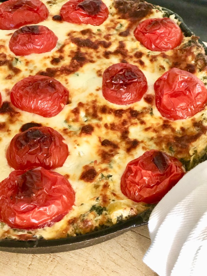 Y’all know how easy this hot dip is to prepare and how well it travels. I made a few additions to this classic appetizer; kind of brought it up to speed. Packed with flavor, this crazy rich dip can be quickly assembled a day in advance then baked off at your leisure. Easily adaptable, the cheeses called for in the recipe can be substituted for other cheeses such as brie, cheddar or provolone. I stay away from smoked cheeses as I don’t care for a smoked flavor in this particular dish. If you feel as I do then pay close attention to the bagged, shredded cheese blend you decide upon. Quite a few of them contain smoked provolone. Just a head’s up. I love baking this dip in a cast iron skillet. It looks so pretty served in the same skillet with a pristine linen hand towel draped over the handle. I store any leftovers right in the skillet or casserole dish in which the dip was baked then, to reheat any leftovers, I merely toss the plastic wrap covering it and pop the leftovers into a 350° for 15 or 20 minutes. All my baking dishes are refrigerator to oven safe. If your baking dish is not, you will need to bring the leftovers to room temperature prior to reheating. Any ripe tomatoes you may have on hand are fine to use. I happened to have a box of perfectly ripe Campari tomatoes but only because Publix had a BOGO going on. I have to say they were delicious and the perfect size. The bright tomatoes cut through the richness of all the cheeses making a most lovely mouthful. I use canned, quartered artichoke hearts as they have more flavor than frozen. The dip can be served with crostini, crackers or crudite. I bought a bag of parmesan-garlic baked bread rounds from the bakery section of the grocery rather than cut and bake my own crostini. Call me lazy. I don’t care. Happy Game of Thrones!