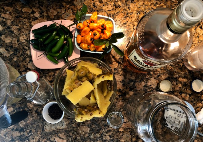 - Have your bottles or jars with lids, clean and dried. Any peppers left whole are to be pierced to allow their flavor to come out and it helps cut down the peppers floating to the top of the container.