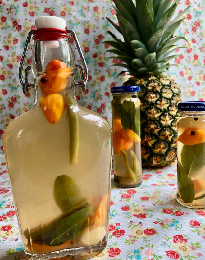 Puerto Rican food is, for the most part, not spicy hot. Is it well seasoned? You bet it is. But hot-pepper hot? Not really, with the exception of pique, pronounced PEE-keh, Puerto Rico’s all-time favorite vinegar hot sauce. A small glass bottle with a shaker top sits on just about every table and every bottle is different. Everyone has their own recipe adding everything from culantro leaves to whole cloves to a generous splash of rum. I’m partial to the rum. You see, it rounds out the sweetness of the sauce, adds more spiciness to the pineapple juice and has a total love affair with the bay leaves. Pique has vinegar included in the recipe but the other ingredients play a huge part in building the flavors of the sauce. In Puerto Rico pique is splashed on roast pork, cutting the richness of the pig with its acidic command.