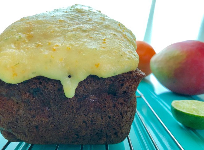 Hey, y’all! I’m fully aware the last post on this blog involved mangoes but it’s the beginning of mango season here in south Florida and, quite frankly, they’re everywhere. Card tables stacked with mango pyramids are beginning to pop up in neighborhoods, typically advertised with the terms of sale handwritten in black magic marker on a piece of cardboard. Some mangoes are ripe while some are a few days out and only require a little time ripening on your kitchen window sill. All the mangoes are perfect. There are no bite marks made by squirrels nor are there any holes pecked by birds. No, these smooth ovals are worth every bit of the 50¢ price tag. I’ve been out on a run and been flagged down in the middle of the road by the head maintenance man at one of the estates in our neighborhood. This particular man is from Trinidad and knows his mangoes. He gave me, oh, I don’t know, maybe five or six? I clutched the bag of fruit close to me and finished my last mile without dropping one. I know a bag of treasure when it’s given to me. Both my husband and son have come home at different times, from who knows where, with bags of mangoes sent by friends. I’ve had mangoes left on my doorstep by kindly neighbors because mangoes come fast and furious. They are delightful, exotic treats and not to be wasted. There are so many ways to use mangoes from smoothies and pool drinks to salads, salsas and cobblers. This recipe is an easy quick bread that is not too sweet and can be served with or without the glaze. Adding the glaze jazzes up the bread but, fair warning, is highly addictive. When slicing the mango, take care not to slice too close to the pit as that area can be a little stringy. Any stray mango strings can easily be scooped out from the batter and be either eaten or discarded. The addition of rum is optional and although you won’t taste it, the rum does add another layer of flavor. It gives the mango a deeper presence and, please know, the alcohol burns off while the bread bakes. This bread freezes well, however, must be popped, tightly wrapped, in the freezer without any icing or glaze. To ice or glaze the bread after freezing, simply mix up the glaze and decorate the top after the bread has thawed. Toasted and given a smear of peanut or almond butter, un-iced mango bread is a great breakfast on the fly or, when iced or glazed, as a mid-morning break with a cortadito. Welcome to mango season!