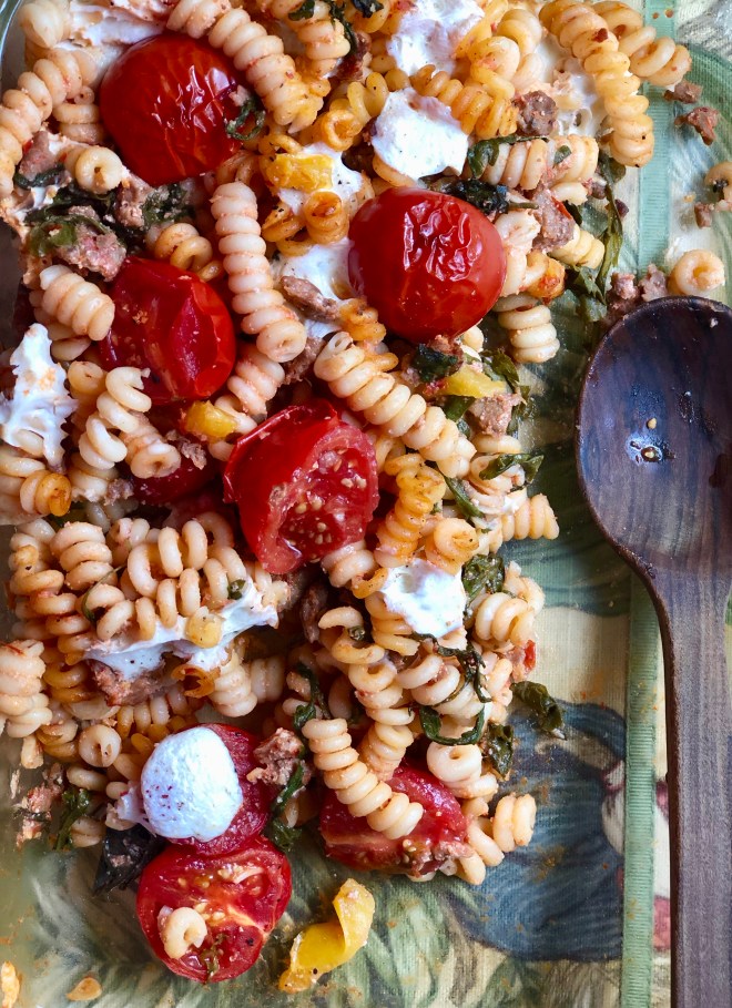 Hey, y’all! We all love one-pan dinners and this is no exception. This baked pasta dish can be assembled in advance to be baked off later in the day or even the following day. Which means if you have one assembled in your fridge, when you come home from work all you have to do is pop it into the oven and by the time you’ve kissed bae hello, poured yourself an ice-cold glass of sauvignon blanc and dried off from a quick shower, you could have dinner ready. And a relatively healthful one at that. If you’re not a fan of arugula, spinach can be substituted or added. The same goes for the basil… and the cheese. I love that I can prepare half the recipe for my family and gift the other half to a friend in need. Or my little sister, who always needs it. This is a super adaptable dish so there’s no stressin’ here.