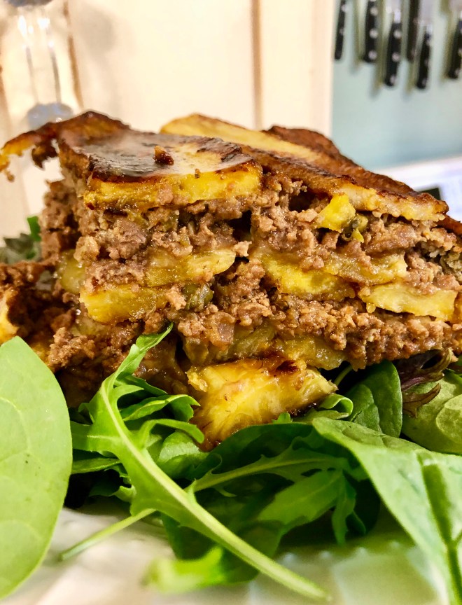 A country-style layered dish, Piñon, is a hearty dish made with well-seasoned ground beef, a little cheese and a whole bunch of sweet and soft, deep yellow plantains. Yellow, highly ripened plantains are known in Puerto Rico as “maduros”, pronounced mah-DOO-ros. In Hispanic restaurants, you’ll often find maduros baked or fried in butter, all sweet and salty, in their melting, soft glory, gracing the side of your plate, in between the rice and beans and palomillo or carne frita. Green or yellow, the plantain is something to be admired. It takes all forms and performs well. Sautéed, roasted, grilled, fried or mashed, the fruit is low in sodium, high in potassium and vitamin A and a terrific source of fiber.